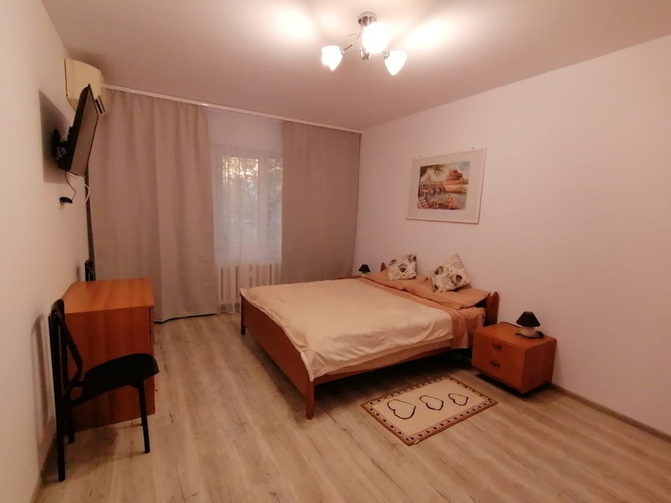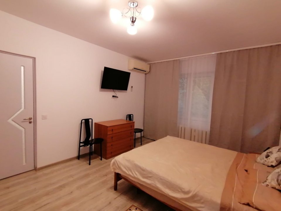 Camera este dotata cu pat matrimonial, dressing cu multiple spatii de depozitare, comoda TV, 2 noptiere, aer conditionat Mitsubishi de 12.000 BTU si televizor. Bucataria este dotata cu mobila moderna si echipata cu plita marca Bosh, cuptor electric Hotpoint, frigider Samsung, masina de spalat Candy cu uscator, hota, masa de 2 persoane. Baia este si ea complet renovata avand toate obiectele sanitare noi si cabina de dus cu scurgere in pardoseala.