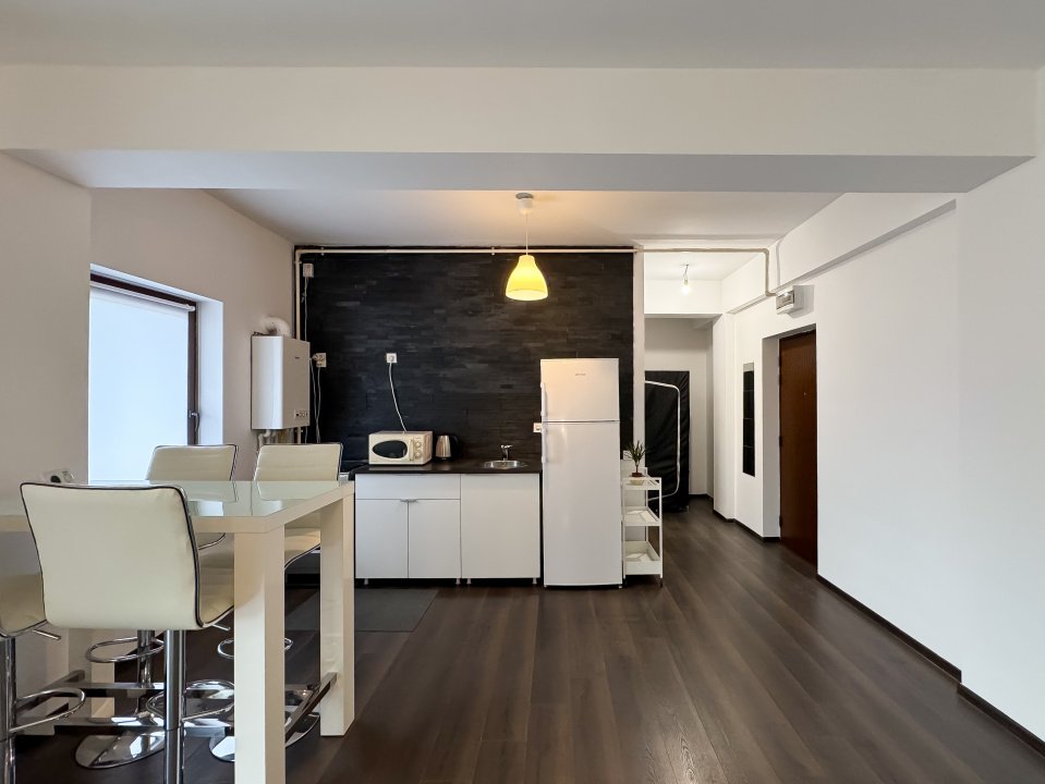 Garsoniera este compartimentata practic, cu bucatarie deschisa, zona de zi generoasa, baie cu fereastra si finisaje moderne. Vine la pachet cu un loc de parcare inclus, un detaliu important pentru confortul de zi cu zi.