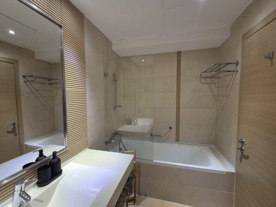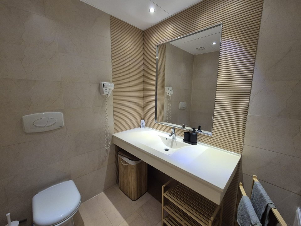 Baie modernă, cu finisaje elegante și spațiu generos la chiuvetă