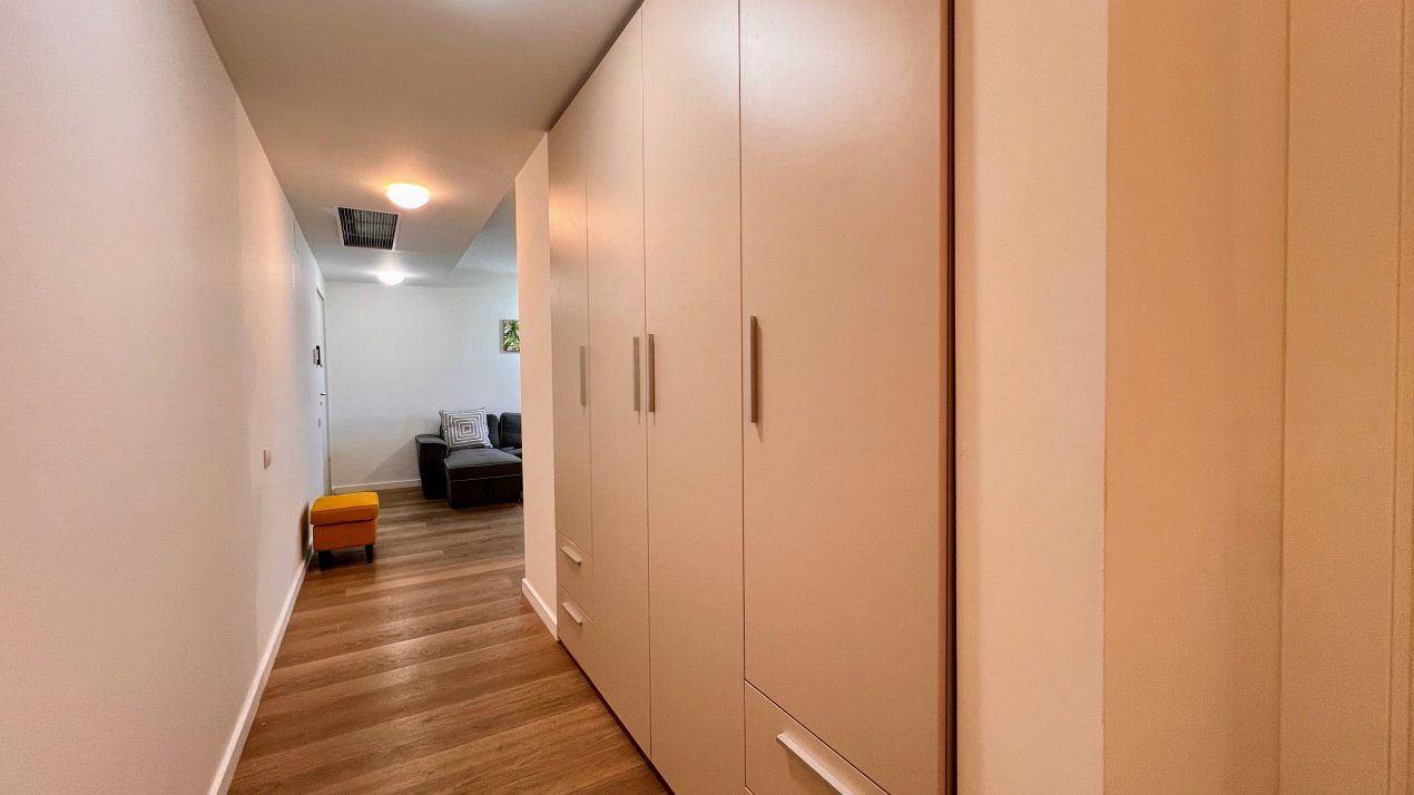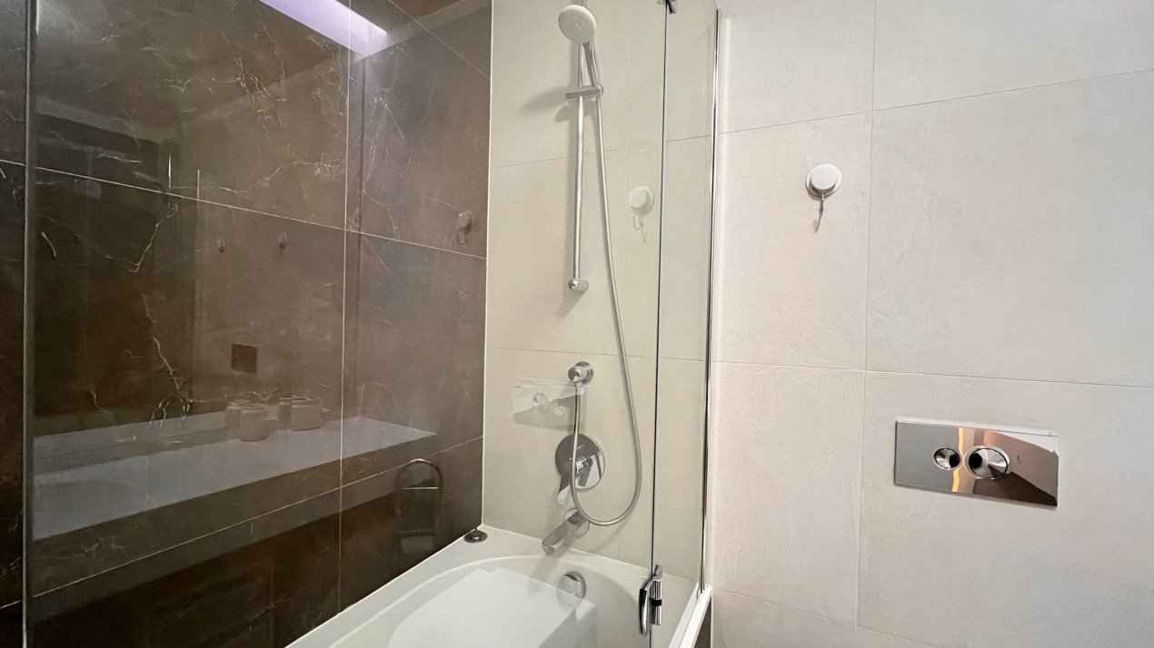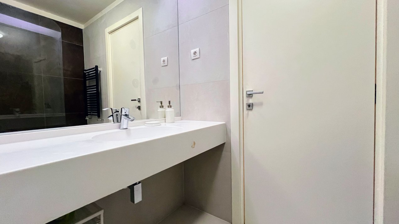 Baia deservește atât zona de zi, cât și cea de noapte a apartamentului, fiind complet utilată cu lavoar, vas WC, cadă și spații de depozitare bine optimizate.