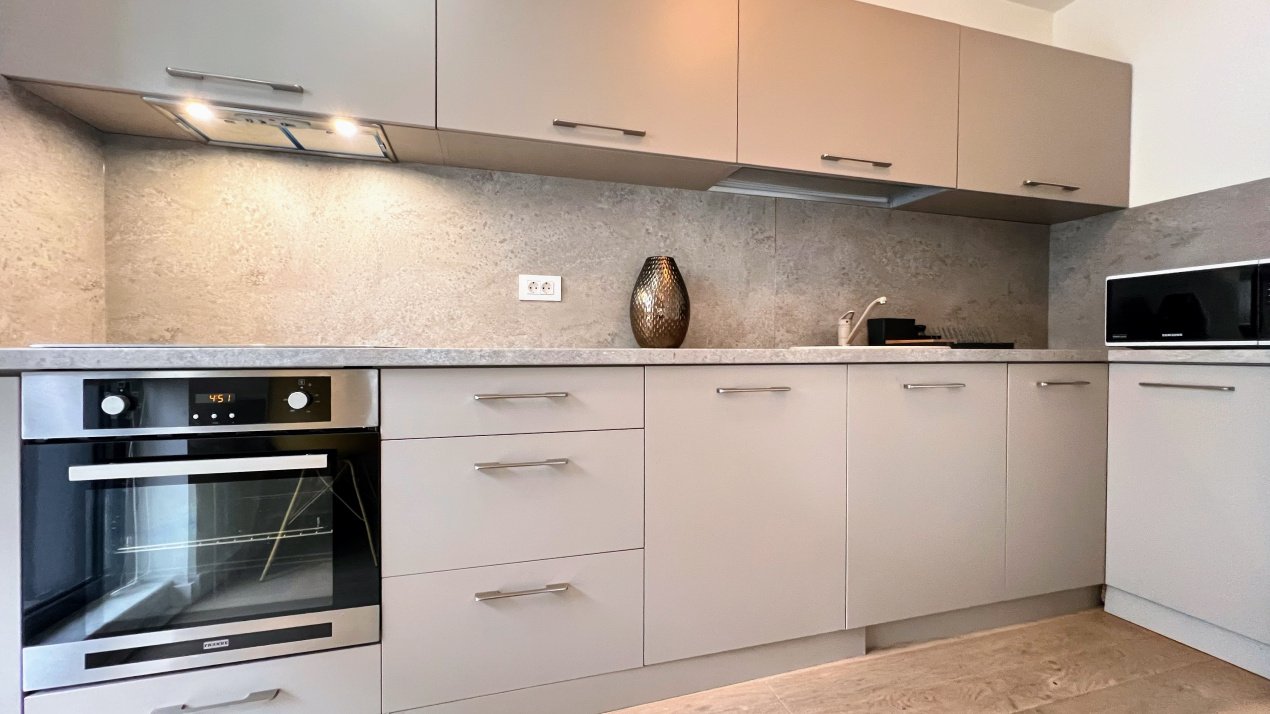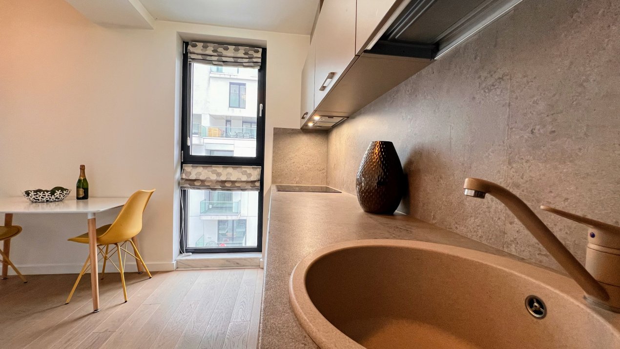 Bucătăria, parțial deschisă către living, beneficiază de acces direct și este complet mobilată și echipată cu electrocasnice moderne, noi, integrate elegant în mobilier. De asemenea, include o zonă dedicată servirii mesei, ideală pentru două persoane.