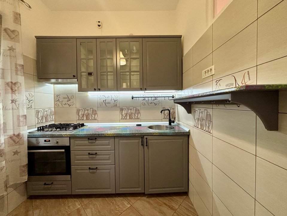 Spațioasă și modernă, bucătăria dispune de toate electrocasnicele necesare – aragaz, cuptor, hotă, frigider și chiuvetă elegantă