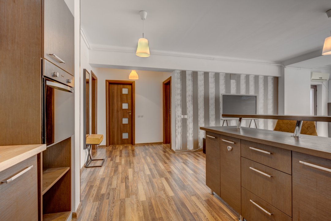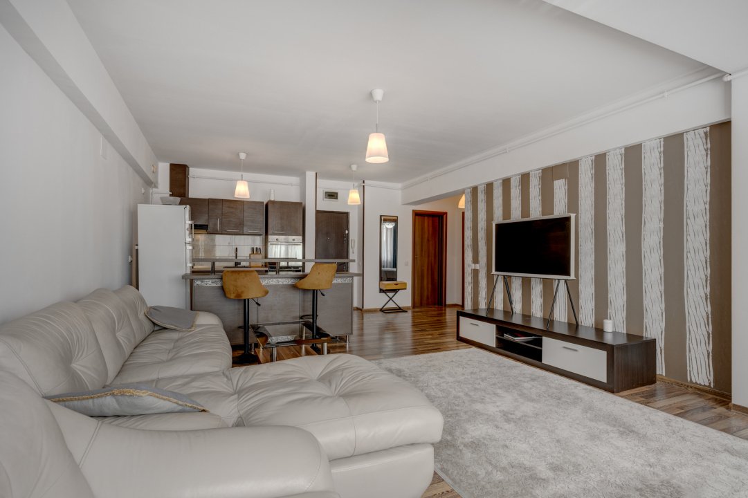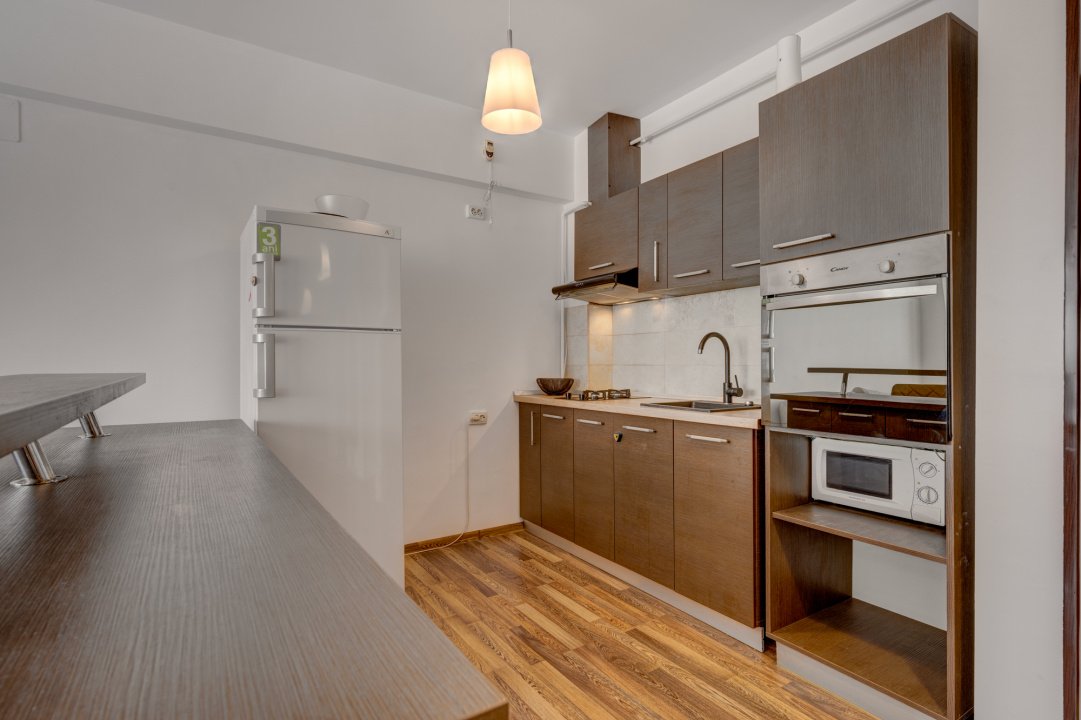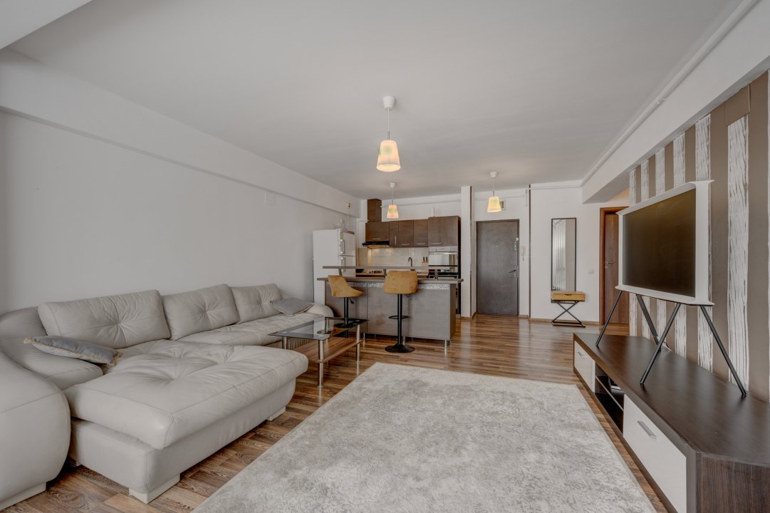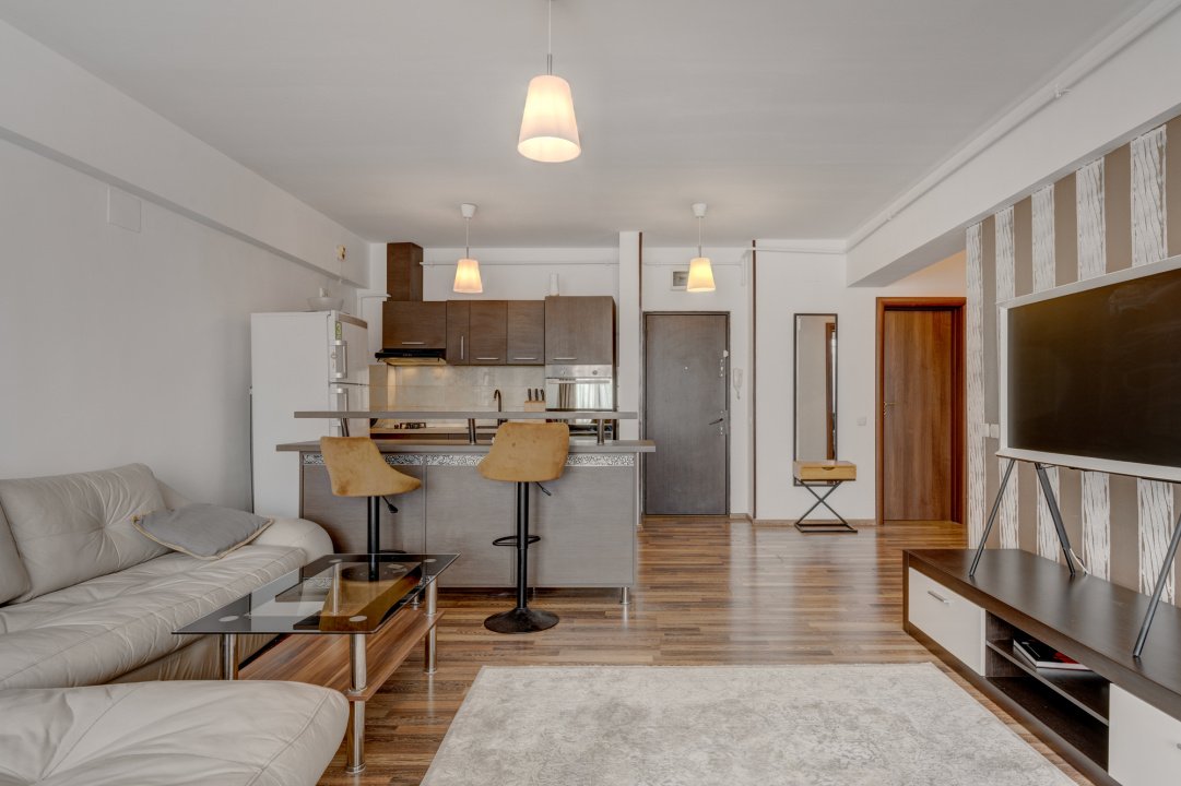 Bucatarie este complet echipata cu toate electrocasnicele necesare ( cuptor, plita, hota, frigider, cuptor cu microunde). Livingul este amenajat cu o canapea generoasa, o comoda cu 1 TV, o zona de luat masa pentru 4 persoane si o comoda generoasa pentru depozitare.