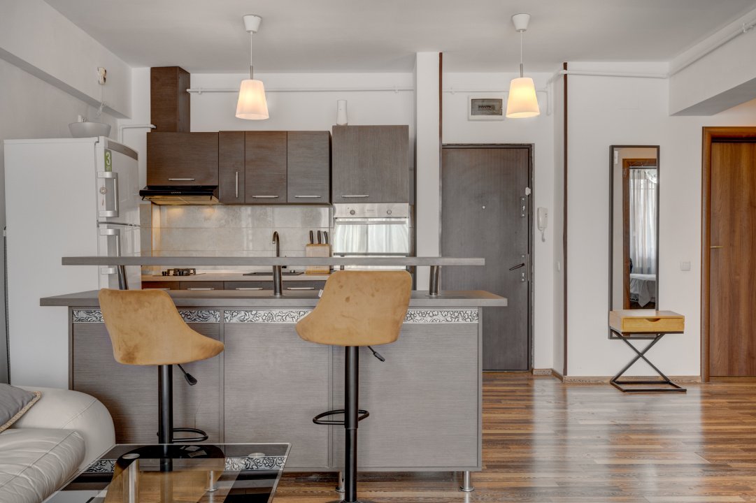 Intre living si bucatarie exista un spatiu tip Insula cu zone de depozitare in partea de bucatarie si 2 scaune de bar in partea de living, spatiu ideal pentru servit micul dejun sau cafeaua.