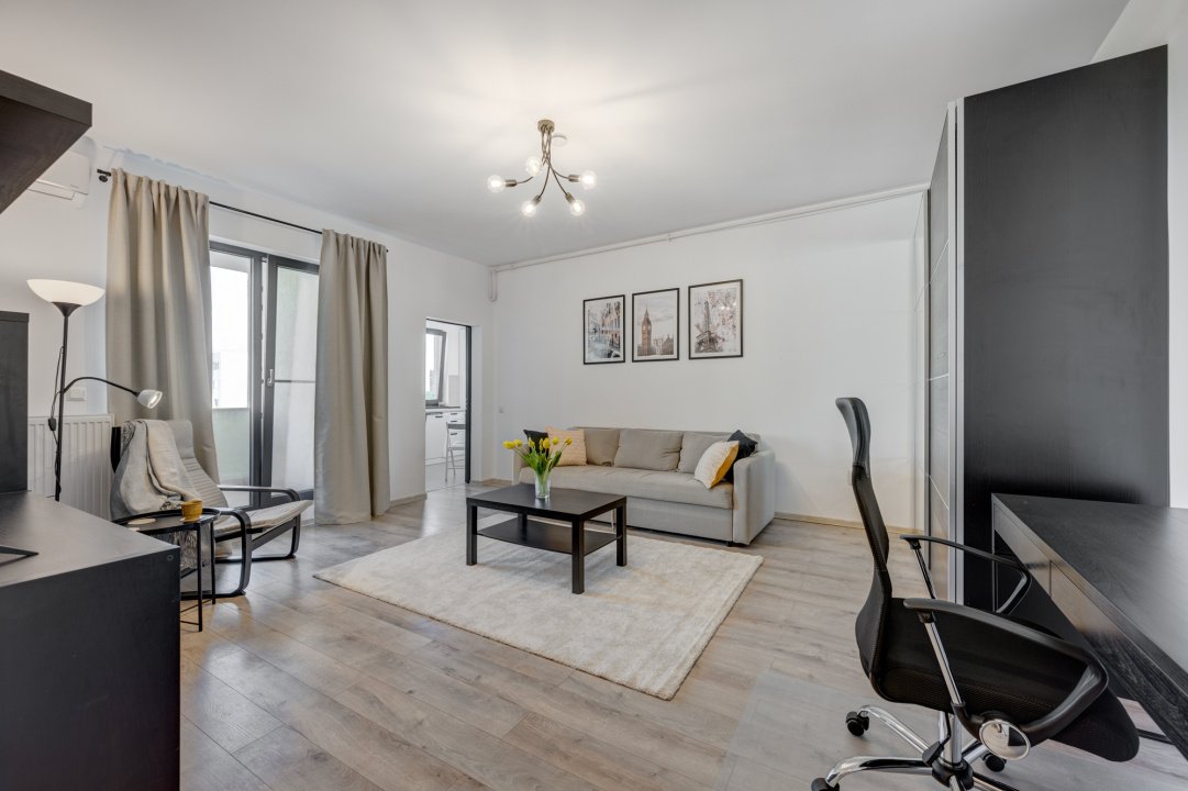 Livingul este foarte spatios si  luminos, beneficiaza de ferestre panormaice si acces catre terasa. Este amenajat modern, dotat cu canapea extensibila, dressing, biblioteca, 1 birou si un scaun de birou, un fotoliu IKEA, o masuta pentru cafea si TV.  In cazul in care lucrati de acasa, in living este deja montat un birou. Exista deja abonament activ la cablu Tv si internet (DIGI).