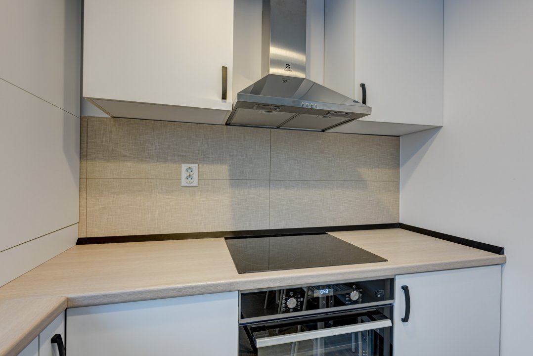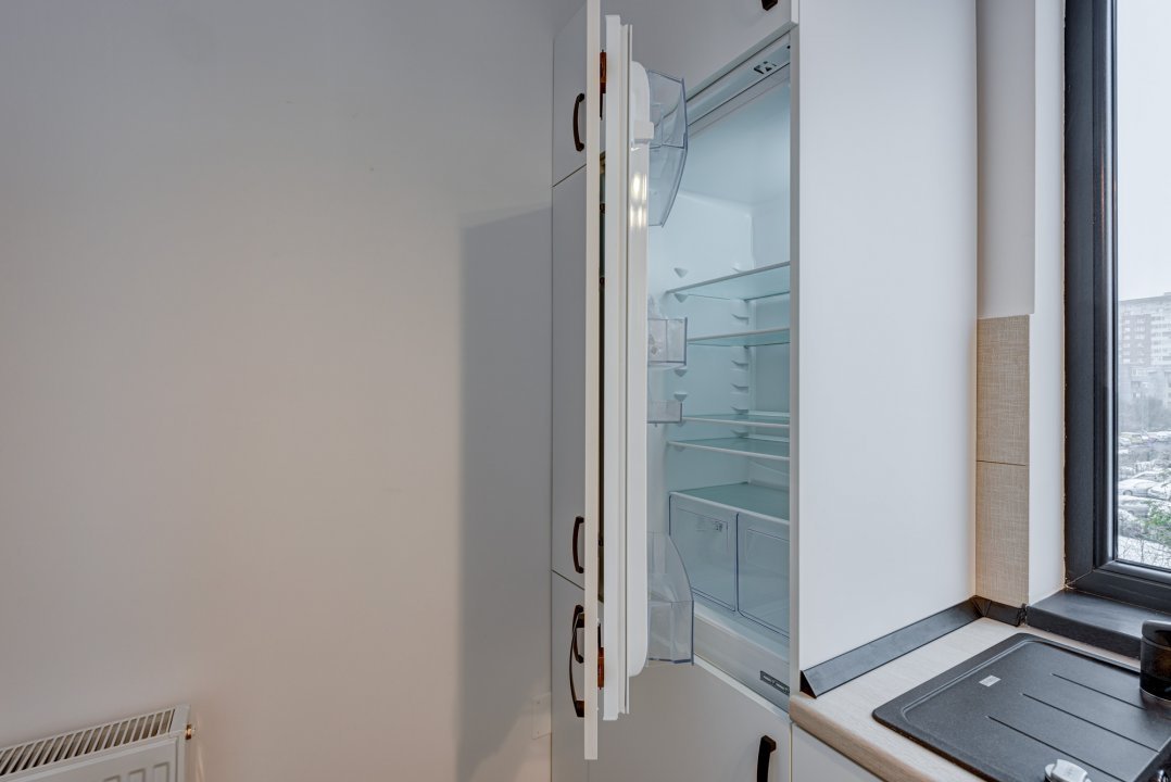 Bucataria este complet mobilata si echipata cu electrocasnice incorporate, gama Electrolux: plita cu inductie, cuptor electric, hota, masina de spalat vase si frigider incorporat. Mobilierul de bucatarie este realizat pe comanda si este foarte bine structurat astfel incat sa asigure spatii necesare pentru depozitare. Tot in bucatarie este amenajat si locul de luat masa pentru 2 persoane.