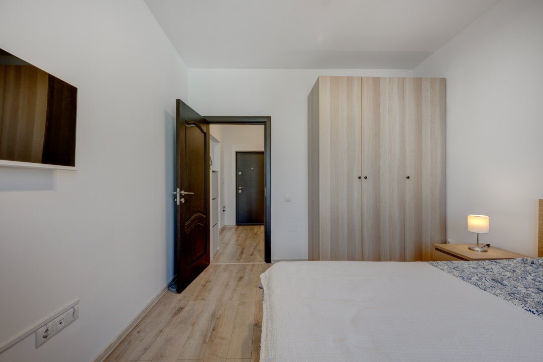 Dormitorul este complet amenajat, dotat cu pat matrimonial si saltea, 2 noptiere, dressing si TV.