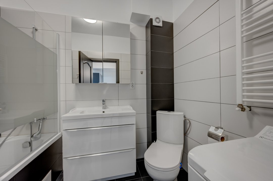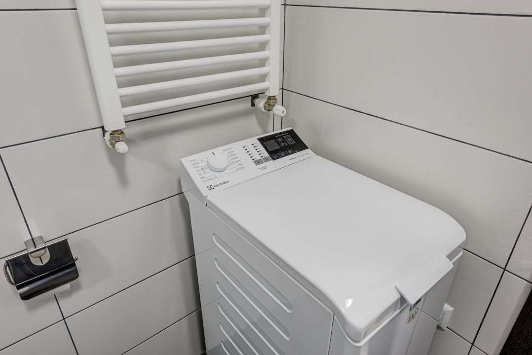 Baia este amenajata modern, echipata cu obiecte sanitare noi, cada si masina de spalat rufe Electrolux.