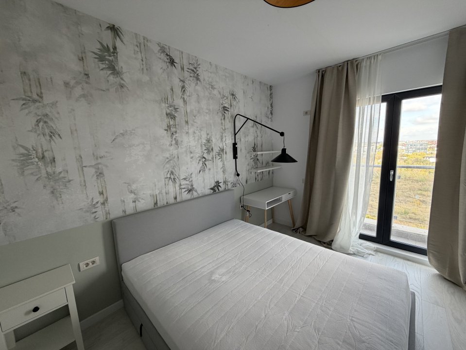 Dormitorul este amenajat cu pat matrimonial si dulap generos, iar baia are finisaje moderne.