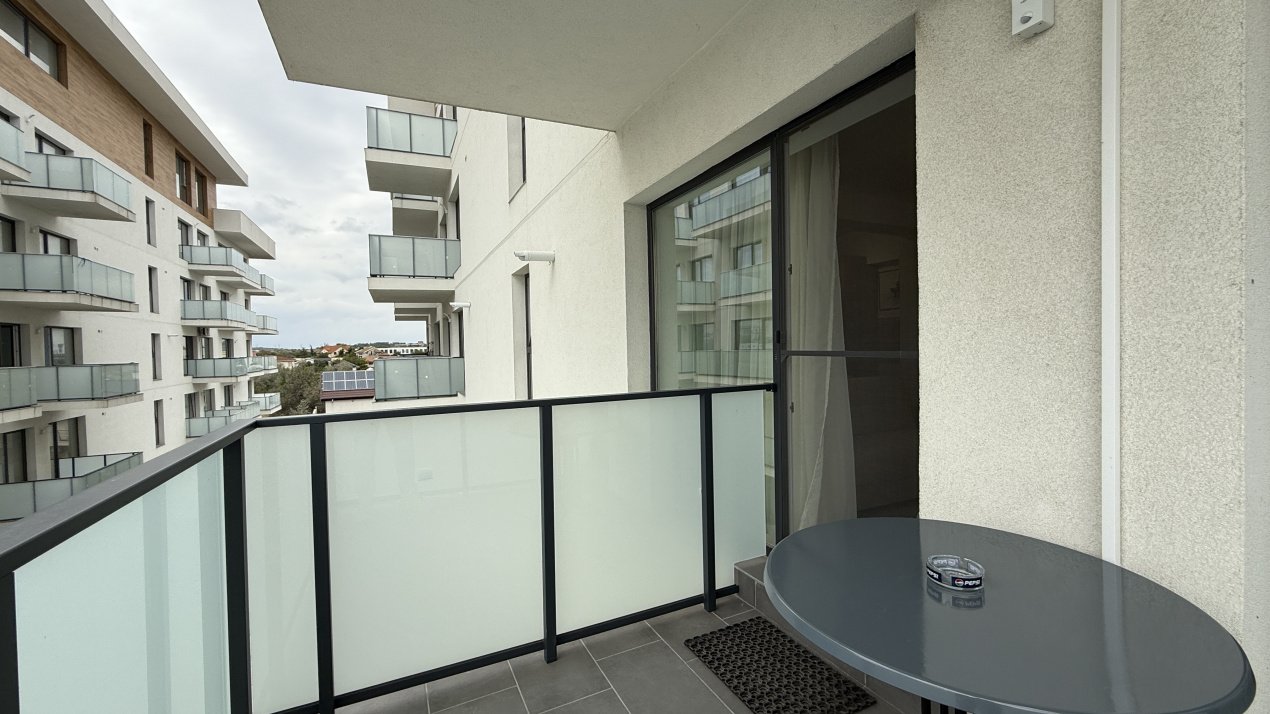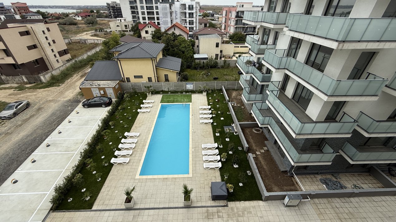 Apartamentul este semidecomandat, are o terasă de 5 mp cu vedere spre Lacul Siutghiol și către piscina ansamblului.