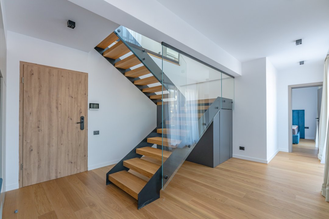 Scară interioară elegantă, care leagă armonios cele două niveluri;