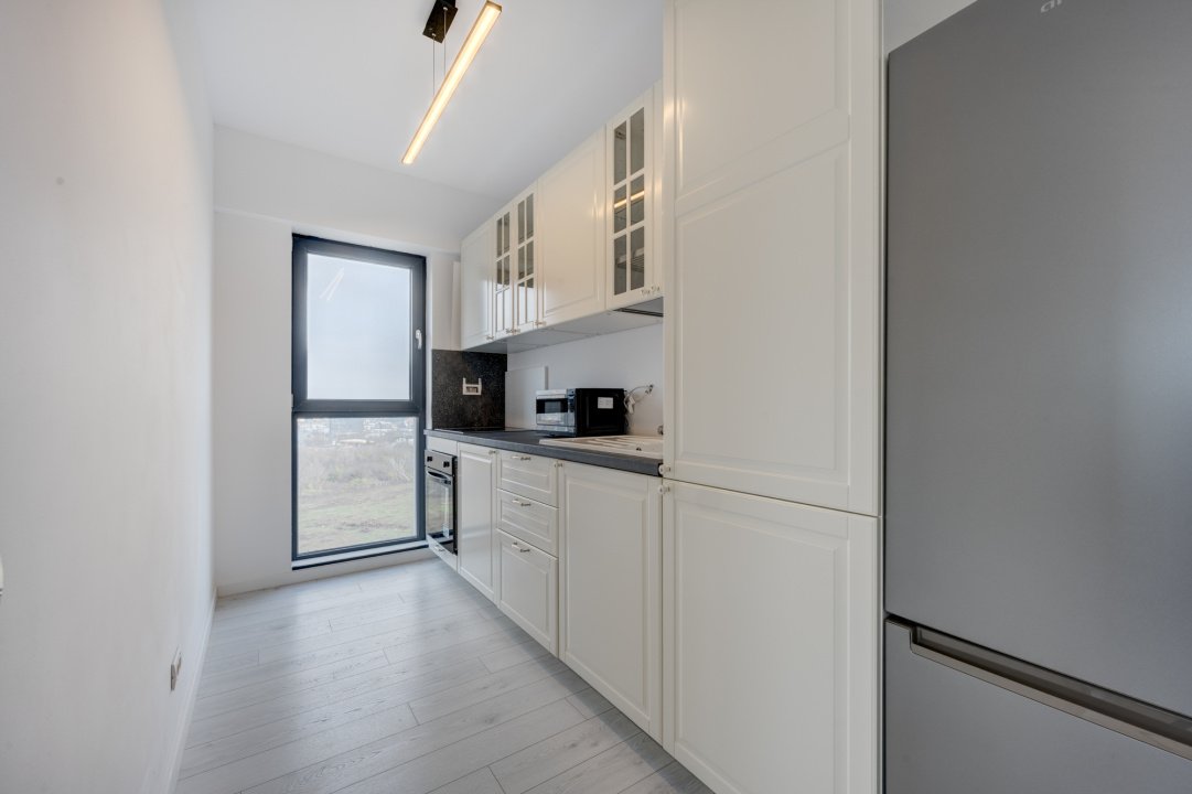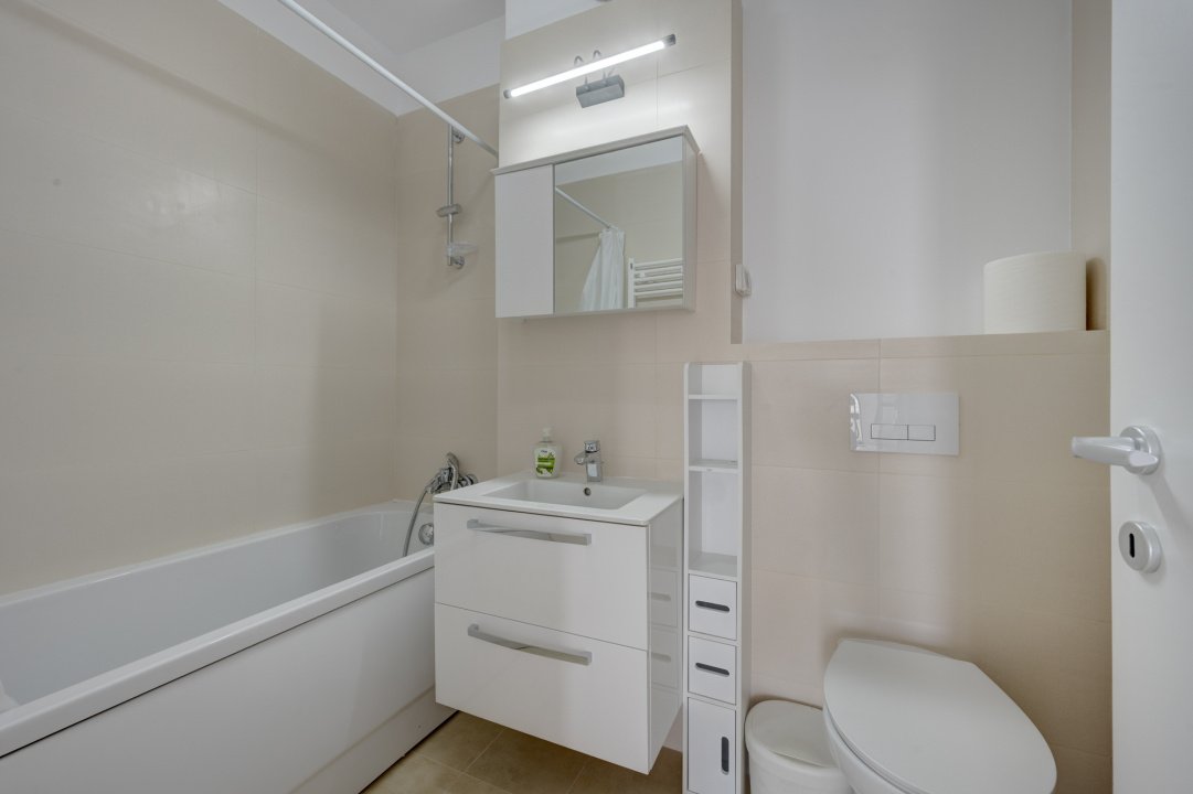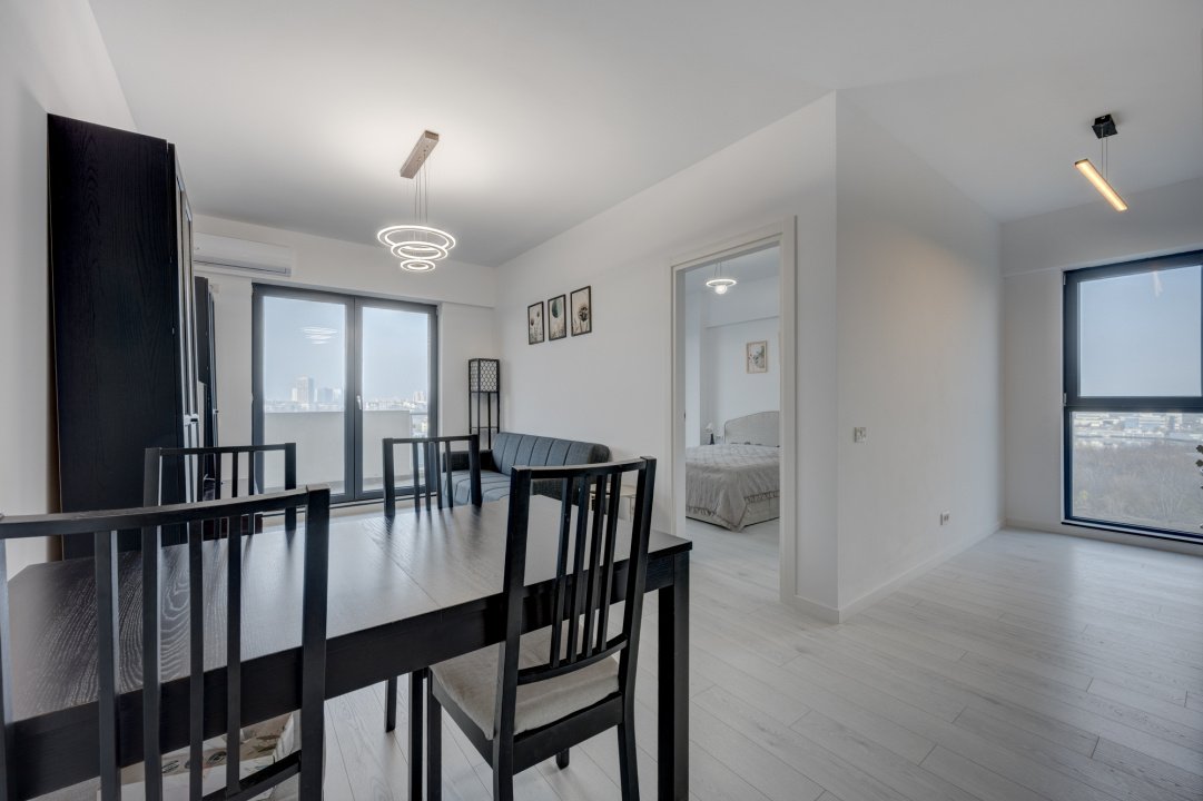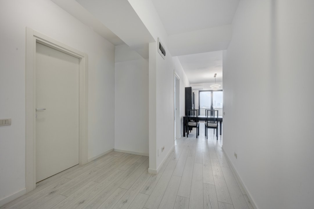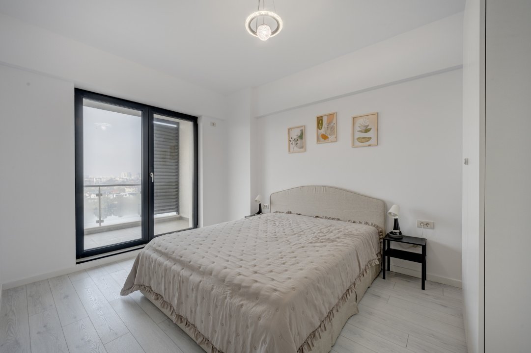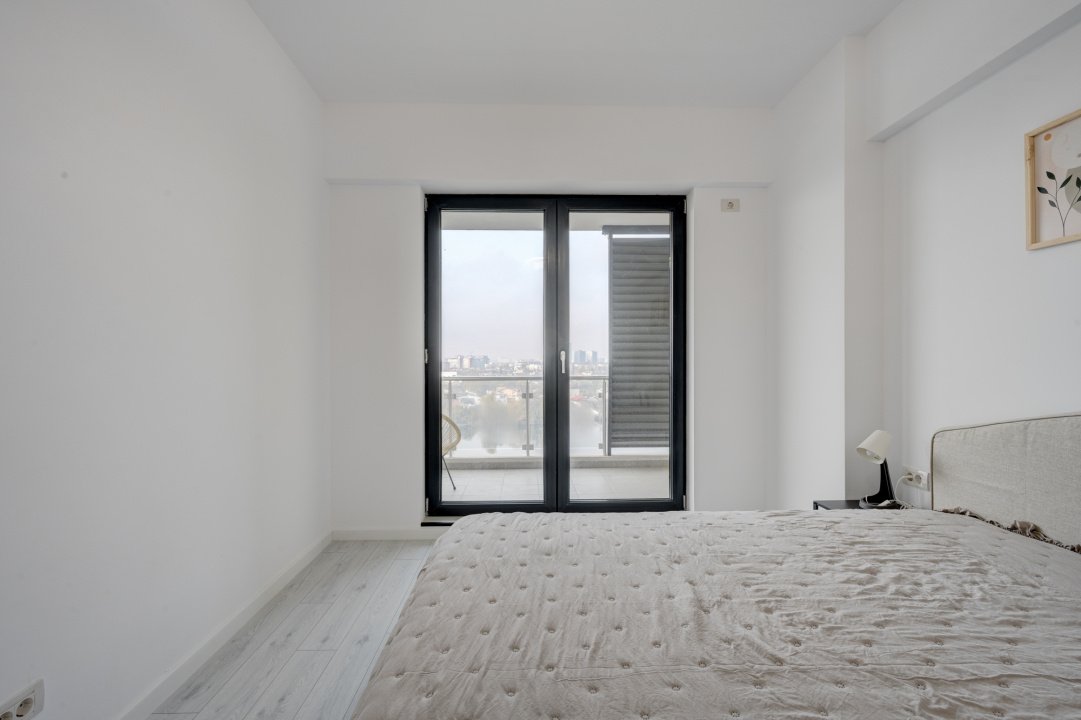 Interior luminos, mobilat si utilat complet, bine compartimentat, cu ferestre panoramice de la podea la tavan, dormitor matrimonial, 2 bai si acces din toate camerele catre terasa de 16 mp cu vedere spre lac.