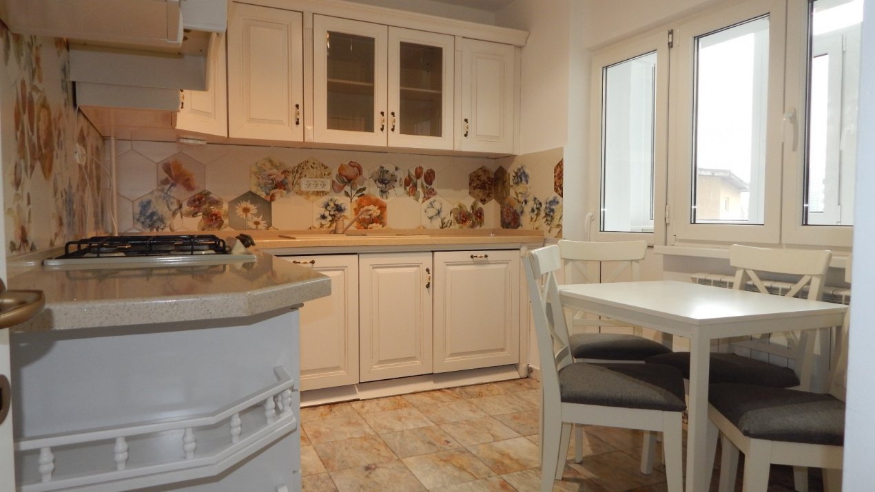 Bucatarie spatioasa, complet mobilata si utilata cu electrocasnice (cuptor, plita, hota, combina frigorifica, masina de spalat rufe si vase). Mobilierul este realizat pe comanda pentru a maximiza spatiul si functionalitatea. Din bucatarie se poate accesa un balcon.