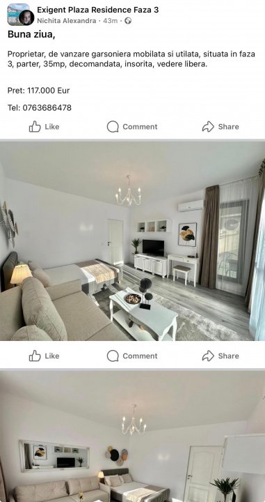 Se ofera spre vanzare garsoniera decomandata, situata la parter, in complexul modern Exigent Plaza Residence – Faza 3. Locuinta are o suprafata de 35 mp, dispune de balcon, este luminoasa, cu vedere libera si se vinde complet mobilata si utilata, gata de mutare sau inchiriere.