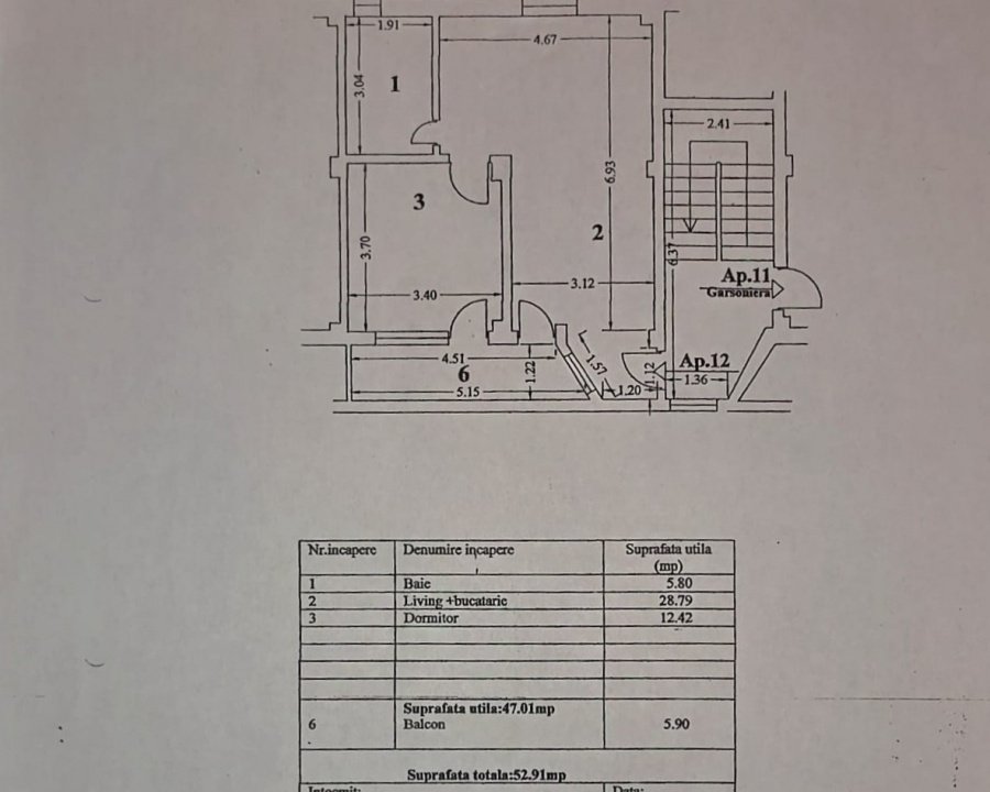 Suprafața totală este de 52,91 mp, din care balconul de 5,90 mp completează armonios zona de relaxare. Compartimentarea permite o utilizare eficientă a fiecărui metru pătrat, oferind lumină naturală și o atmosferă plăcută.