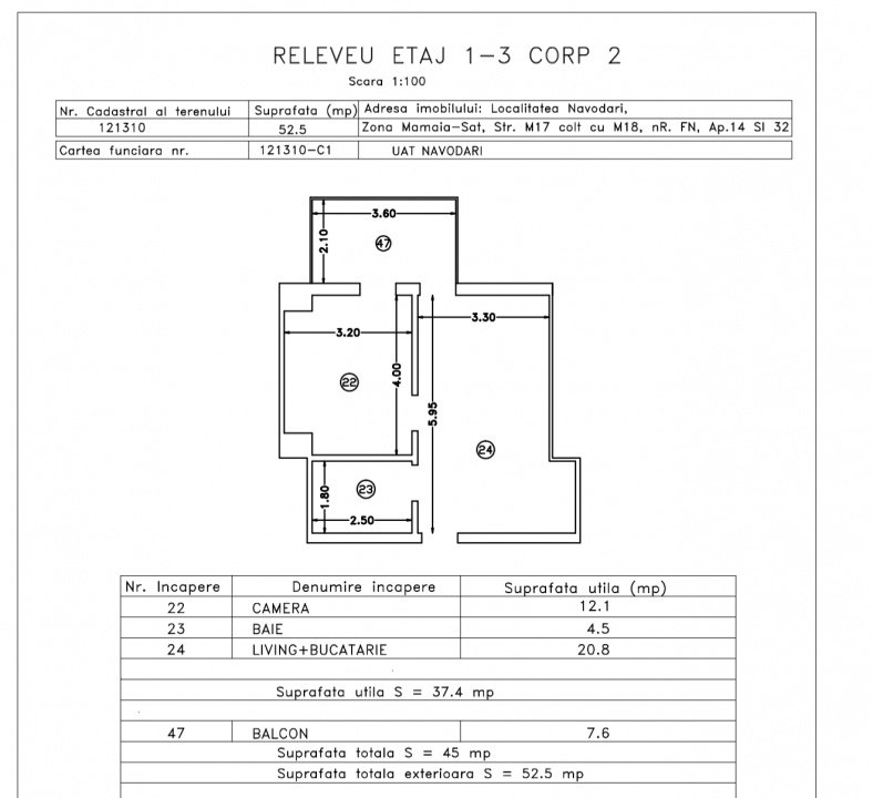 • Suprafață utilă (cu balcon): 45 mp