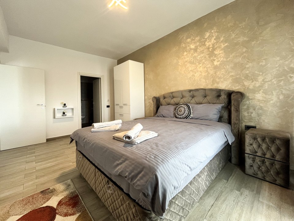 Dormitorul oferă un spațiu intim și relaxant, cu acces direct la terasa ce oferă o vedere frumoasă către lac.