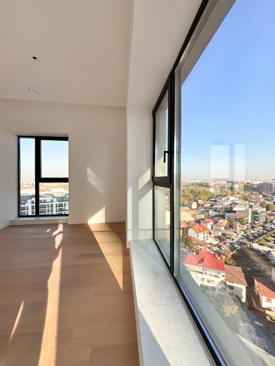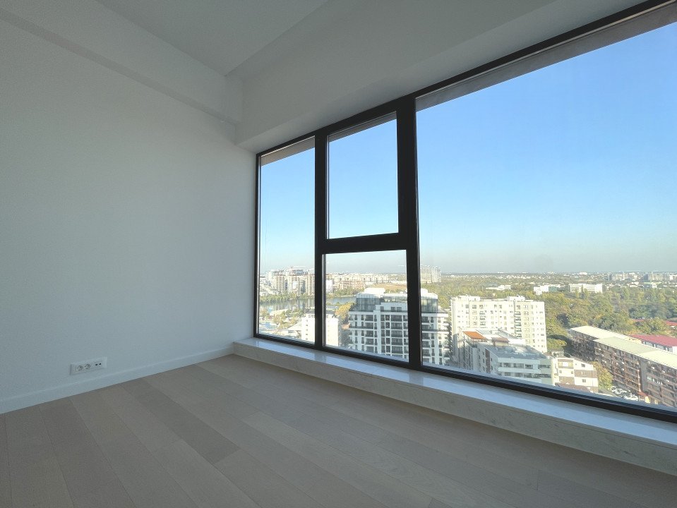 Aflat la etajul al 14-lea ai unei clădiri de 20 de etaje, acest apartament oferă o vedere panoramică impresionantă, având în prim plan zona de case, clădiri noi si Lacul Floreasca. Acest imobil are o suprafata TOTALA de 76mp, având un balcon de 8mp, doua băi, 2 dormitoare si un Living spațios împreună cu spațiul dedicat bucătăriei.