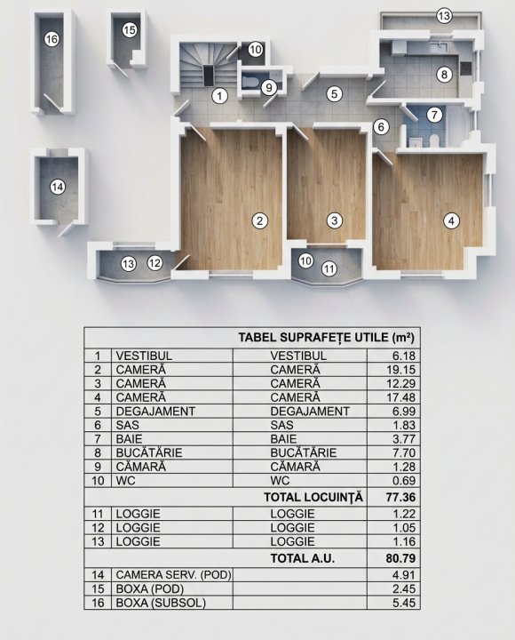 Cu o suprafata utila generoasa de 77,36 mp, completata de 3 logii insumand 3,43 mp, locuinta ofera un total de 80,79 mp inteligent compartimentati. Spatiile sunt luminoase, aerisite si permit amenajarea facila atat pentru o familie, cat si pentru un cuplu care apreciaza confortul.