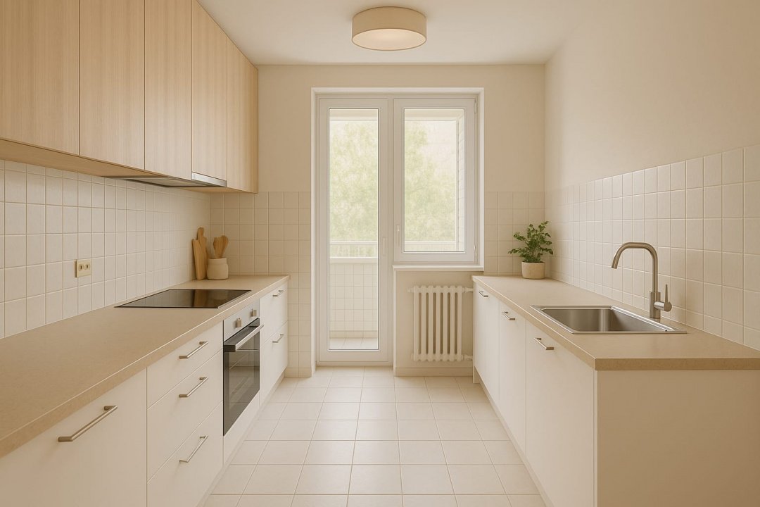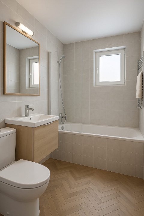 Fotografiile cu varianta renovată au titlu de prezentare și ilustrează potențialul estetic al proprietății după reamenajare.