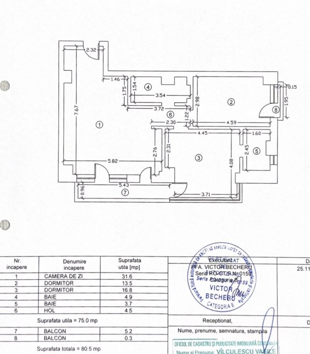 Suprafata totala 80,5 mp din care suprafata balcoanelor este de 5,5 mp. Suprafata construita 98 mp