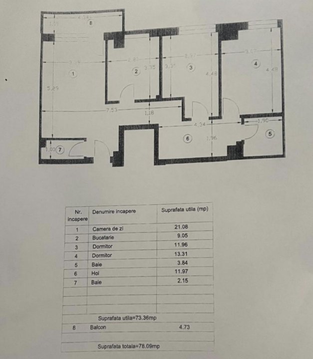 * Suprafață totală: 78,09 mp (inclusiv balcon de 4,73 mp)
