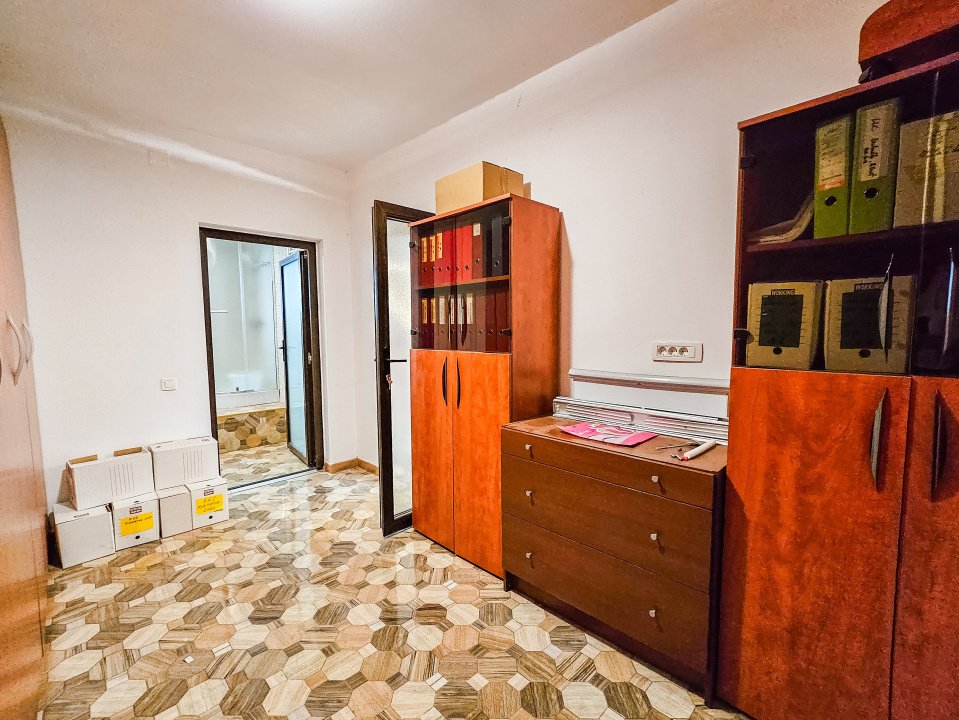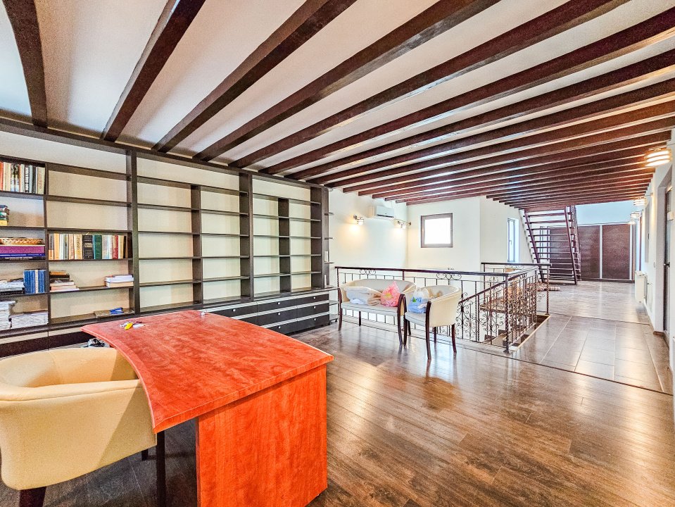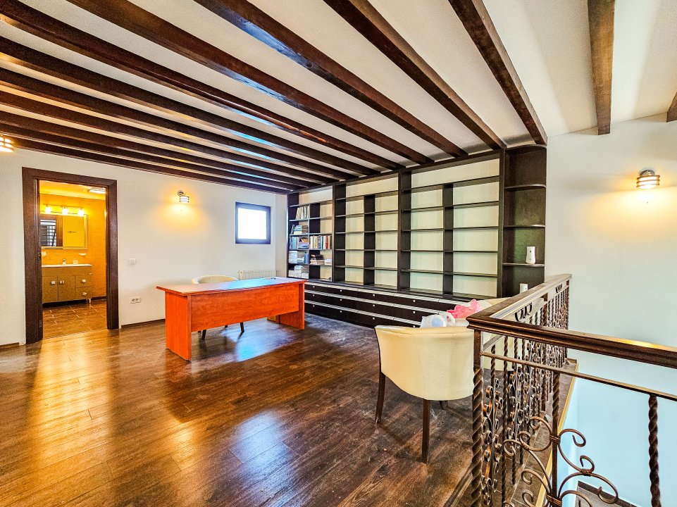 - Etaj 1: cameră de studiu, 2 camere (birouri), baie, terasă mare acoperită
