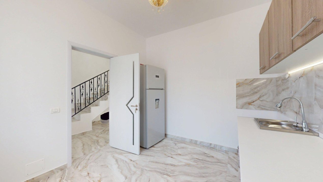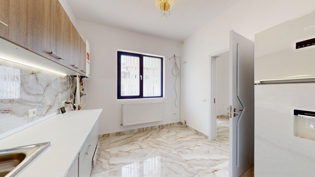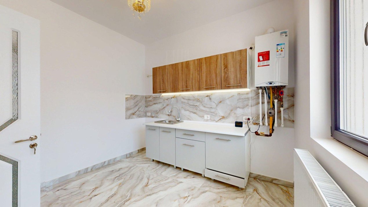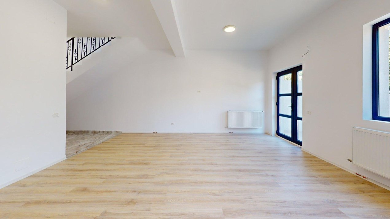 Parter: spațiu tip living open-space (ideal pentru recepție/showroom), baie, bucătărie închisă mobilată (utilă pentru angajați sau activități auxiliare)