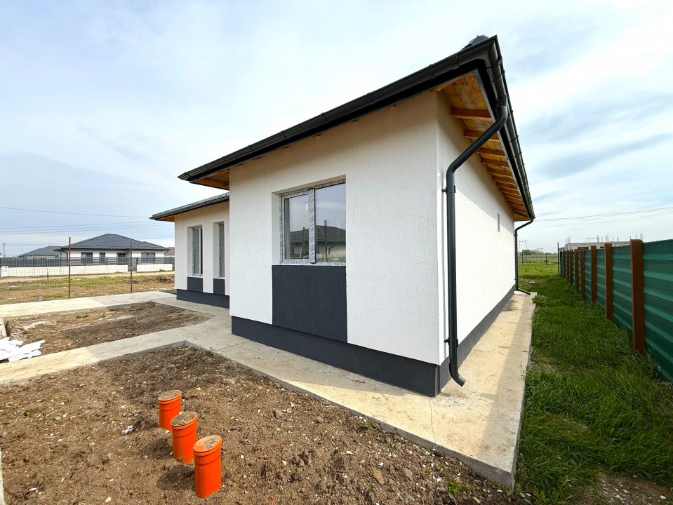 Va propunem spre vanzare vila individuala in suprafata construita de 92,7mp pe terenuri cu suprafate de 340-360mp, suprafata utila de 73mp la care se adauga terase de aproape 12mp. Casa se vinde la gata, direct de la dezvoltator, are compartimentare decomandata, 2 bai, 2 dormitoare, un living si o bucatarie ce se poate inchide. Curtea libera este de aproximativ 250mp. Incalzirea se face pe baza de centrala termica pe curent si incalzire in pardoseala, ceea ce face ca aceasta casa sa aiba consumuri foarte eficiente de energie. Se poate aplica imediat pentru panouri fotovoltaice.
