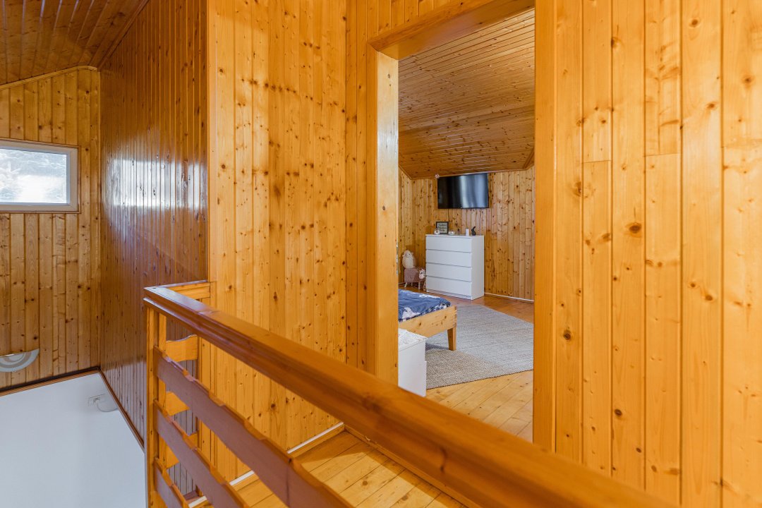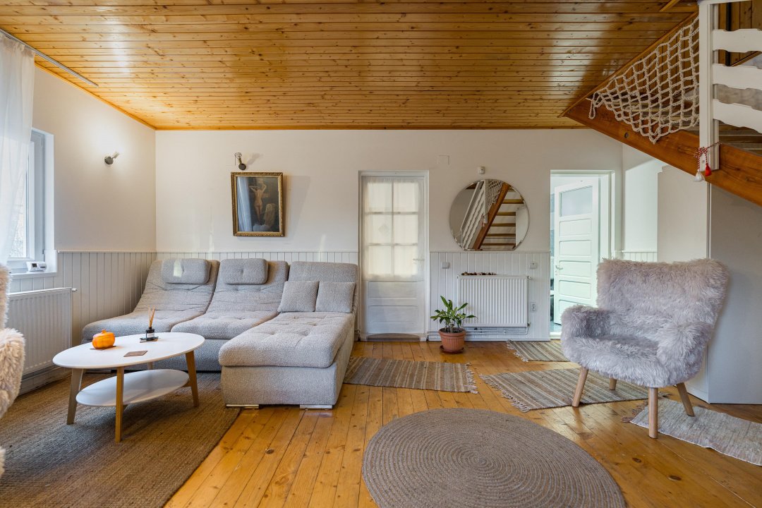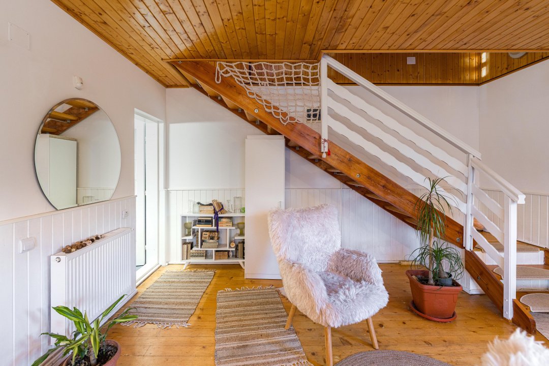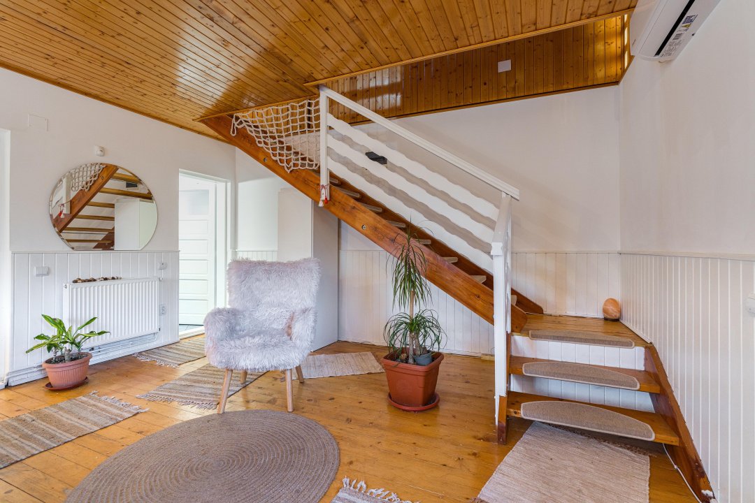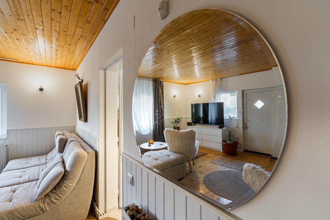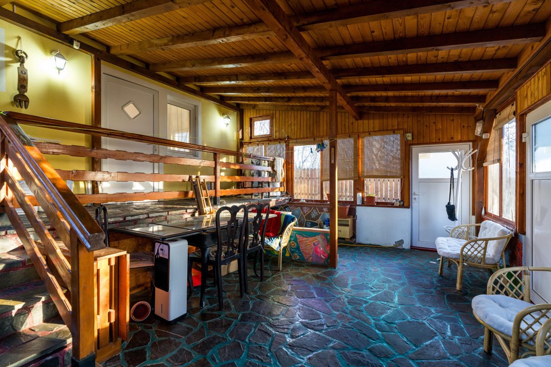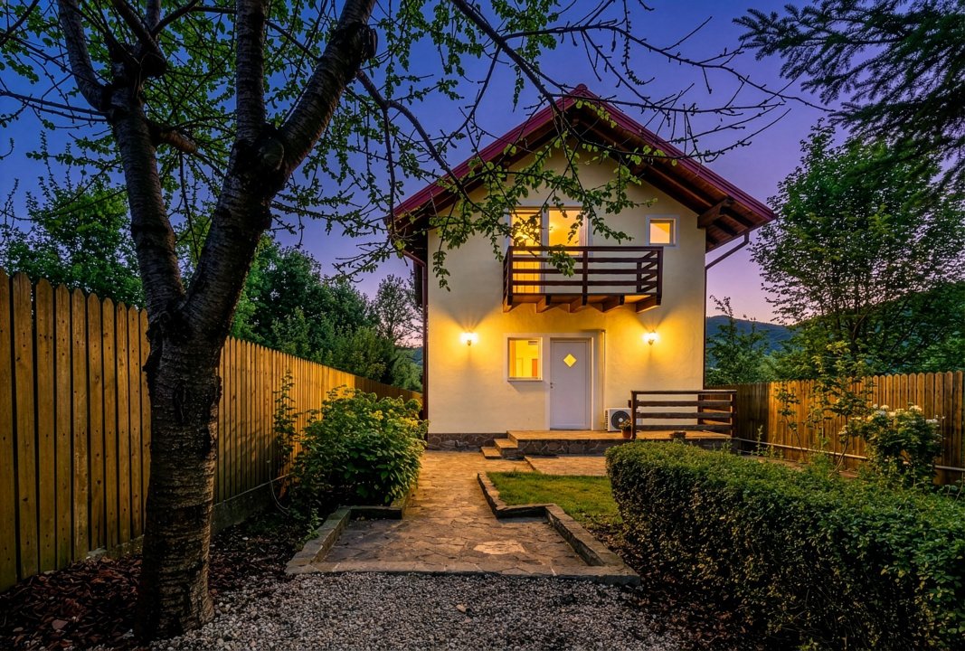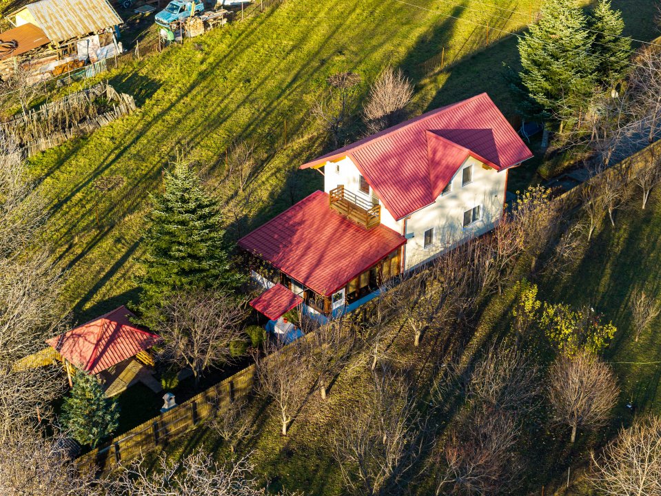 Căsuța are 3 camere, la parter - living, bucătărie, baie și o verandă închisă superbă, la etaj - 2 dormitoare, o baie și 2 balcoane, de unde poți admira frumusețea discretă a munților atât la răsărit, cât și la apus. Interiorul este primitor și elegant, decorat cu accente rustice care amintesc de farmecul vieții autentice de la țară. Încălzirea este asigurată de centrala termică pe gaz Viessmann, iar casa dispune de curent electric, apă de la rețea, fosă septică.