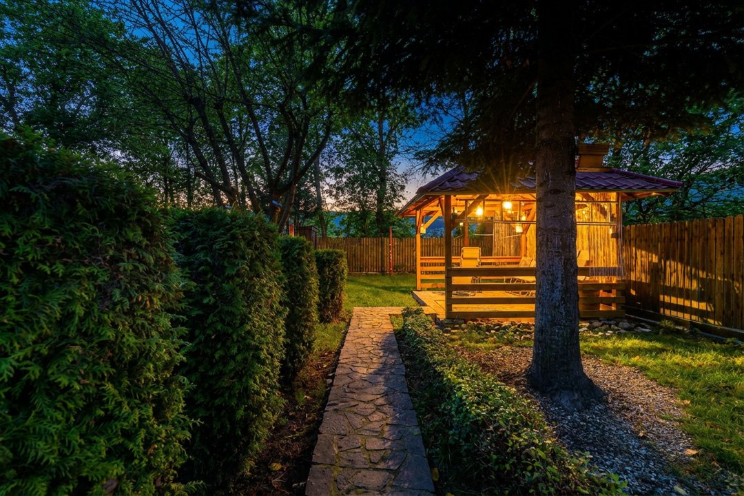 Grădina generoasă (terenul are 729 mp) în anotimpurile calde este plină de flori, pomi fructiferi, fructe de pădure, vegetație montană matură, astfel că indiferent în ce încăpere a casei ești priveliștea este uimitoare, iar foișorul completează cu succes acest tablou minunat. Farmecul acestei case este dat și de faptul că nu se află pe drumul national, este pe partea dreapta a acestuia dinspre Bucuresti spre Sinaia, prin urmare pentru a ajunge aici vei urca spre unul din cele mai înalte puncte ale Comarnicului. Drumul este asfaltat si accesibil, iar seara este un adevărat spectacol de lumini.
