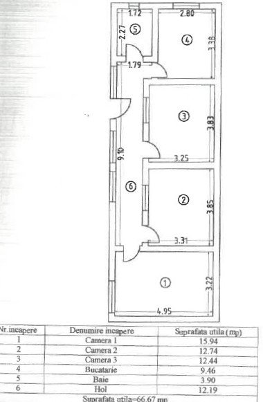 Casa cu suprafata utila 66.67 mp compartimentata in 3 camere, baie, bucatarie si hol.