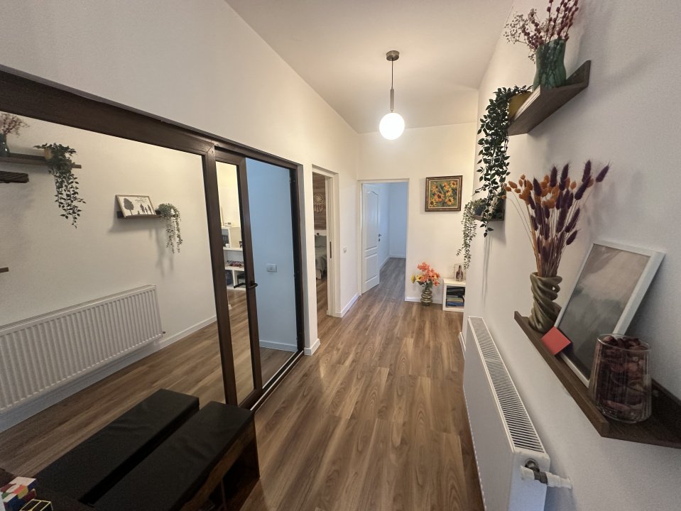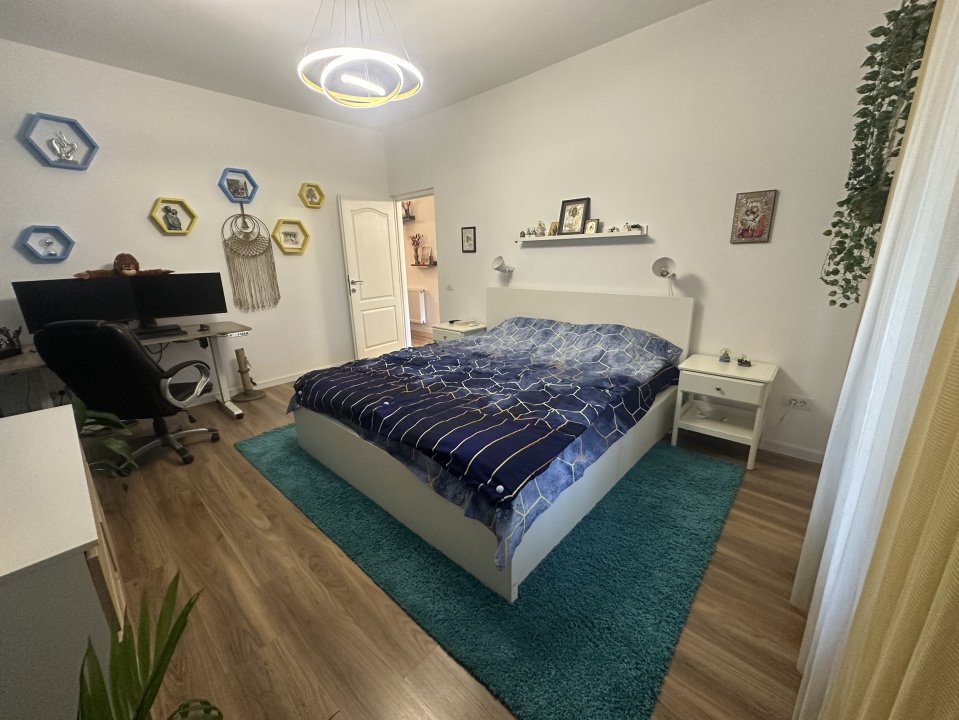 Casa este total mobilata si utilata, are 4 camere: Living spatios, trei dormitoare luminoase, 2 dressinguri, bucataria mare cu camara, are iesire catre terasa din spatele casei, camera tehnica cu centrala termica, baie mare cu cada si fereastra.