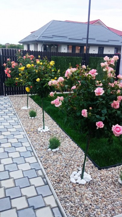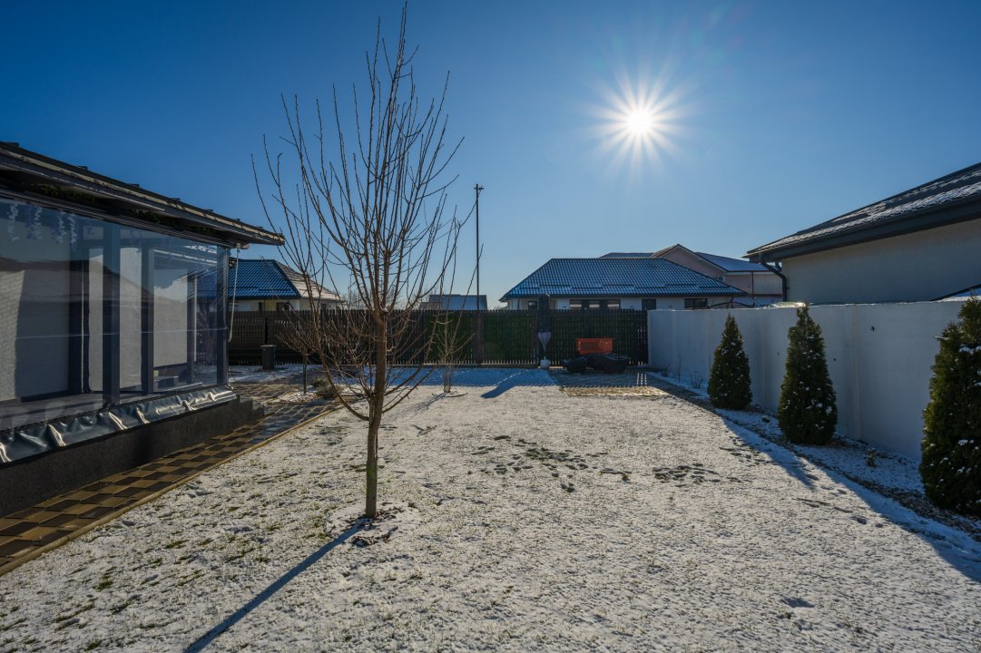 Curtea este matură, amenajată cu gazon, sistem de irigație și peisagistică modernă — un spațiu ideal pentru relaxare, joacă și timp petrecut în familie.