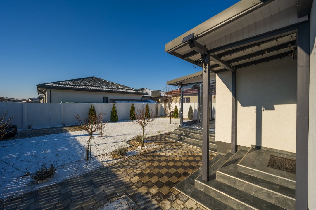 Terasa, cu o suprafață de 12,5 mp, a fost închisă ulterior și a devenit o extensie firească a zonei de zi, realizând o legătură armonioasă între interior și curte.