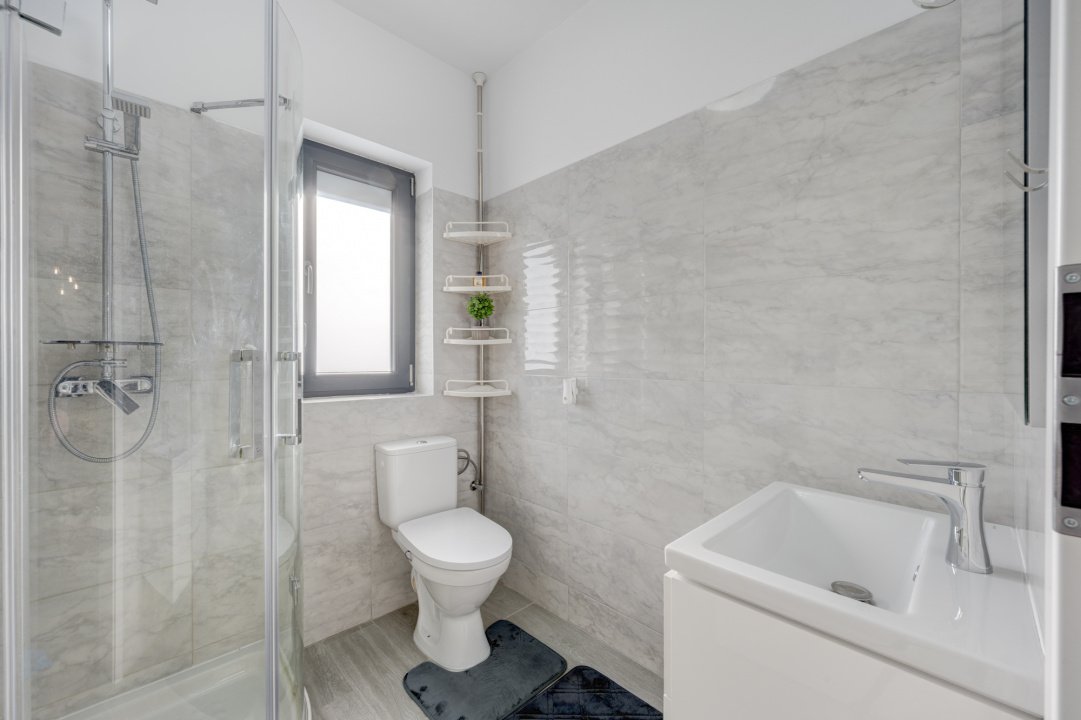 Casa dispune de trei dormitoare aerisite: două dormitoare de aproximativ 13 mp fiecare și un al treilea dormitor de circa 11 mp, potrivite atât pentru odihnă, cât și pentru birou sau cameră de copii. Cele două grupuri sanitare au suprafețe de 4,5 mp, respectiv 3,6 mp, iar holul generos, de peste 8,5 mp, contribuie la senzația de spațiu și fluiditate.