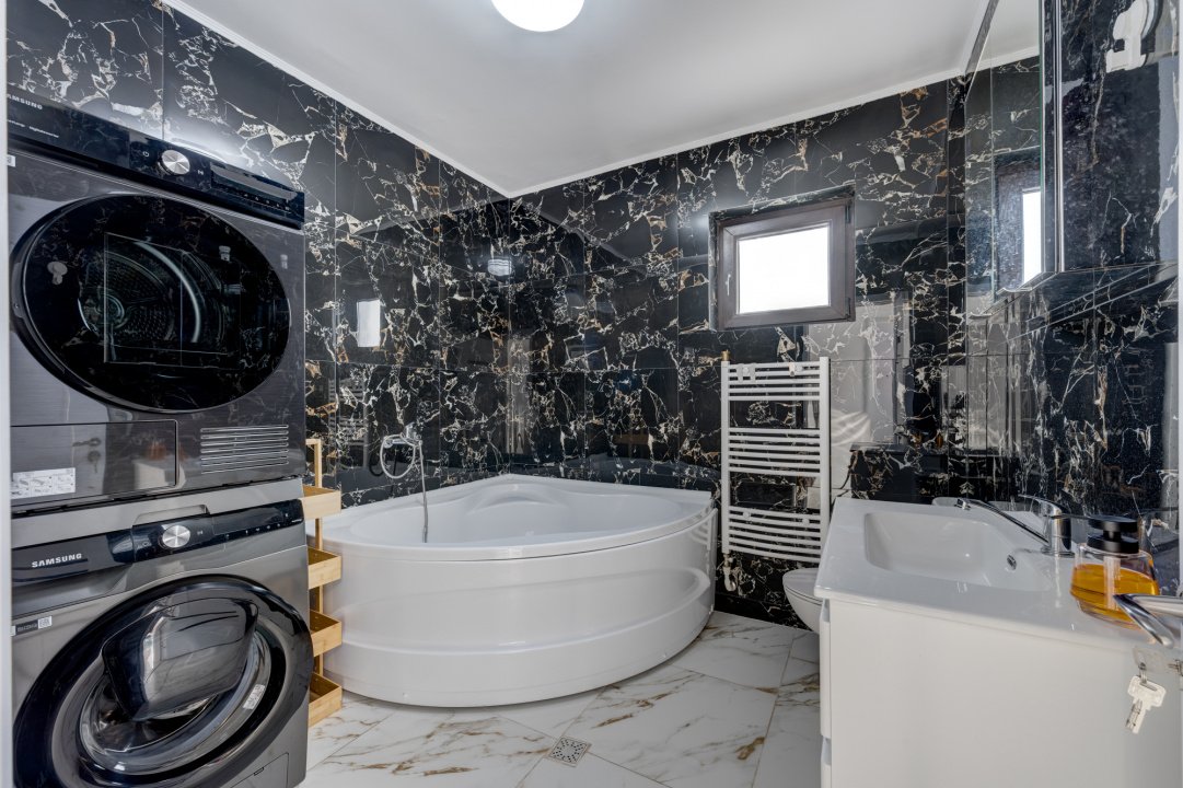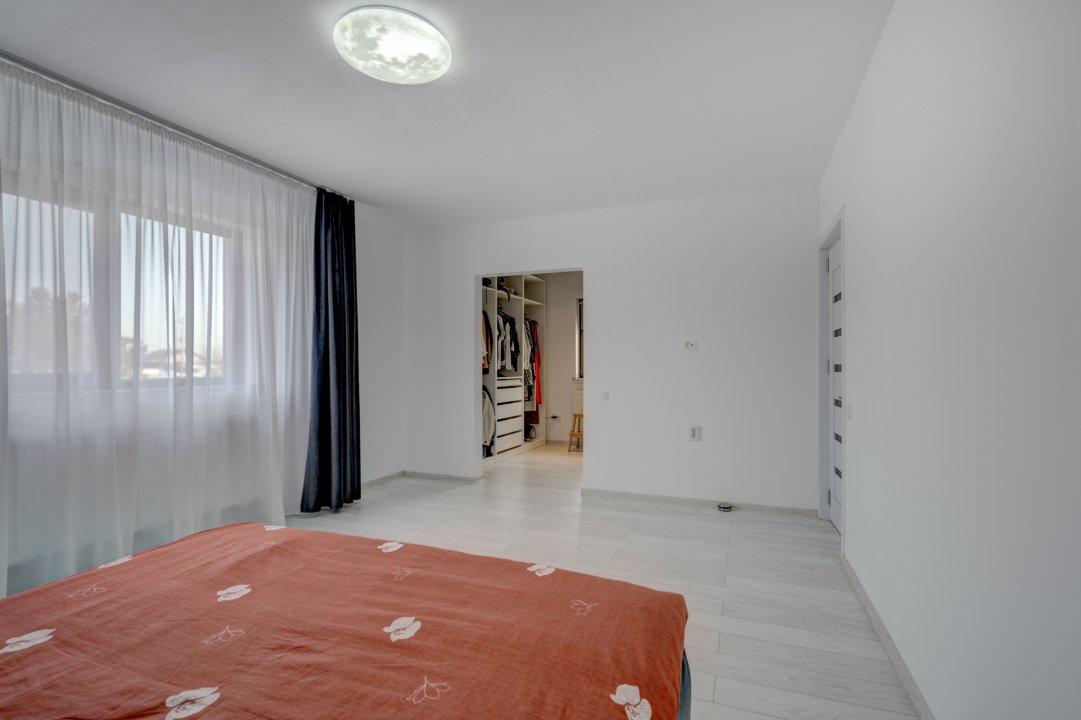 Bucataria este complet mobilata si utilata (aragaz, hota, masina de spalat vase, frigider). Dormitorul de la parter este amenajat cu un dulap generos si birou. Livingul este amenajat cu o canapea, comoda TV si spatii pentru depozitare. Fiecare dormitor are pat iar cel matrimonial are amenajat un dressing deschis.