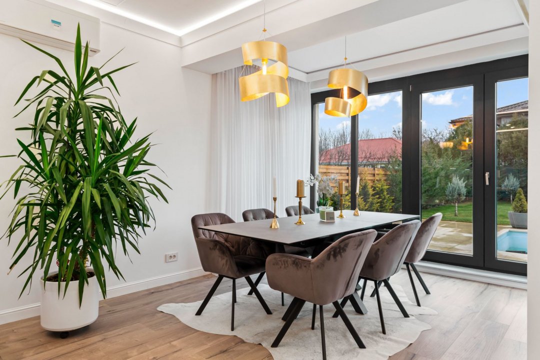 Această proprietate remarcabilă îmbină designul contemporan cu funcționalitatea perfect gândită. Se vinde la cheie, exact așa cum o vedeți: mobilier de calitate, spații impecabil amenajate, o curte matură și o piscină încălzită ce devine centrul vieții de zi cu zi în sezonul cald.