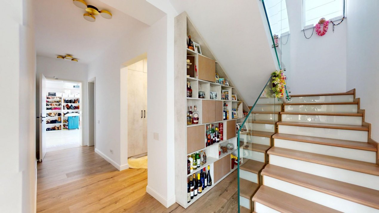 La etaj se află două dormitoare spațioase, două băi amenajate impecabil, un birou liniștit și două dressinguri generoase, dintre care unul transformat într-un spațiu de depozitare și spălătorie perfect organizat.