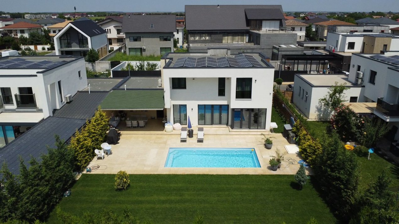Exteriorul este un punct forte: vegetație matură, gazon perfect întreținut, sistem de irigații automatizat și o piscină de 8×4 m încălzită, ideală pentru relaxare sau petreceri în familie.