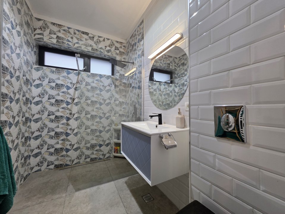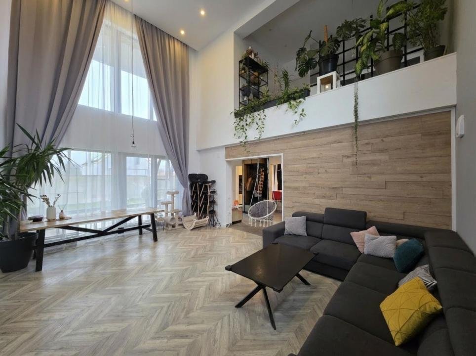 Spațiu aerisit, luminos și extrem de bine organizat, cu living impresionant pe dublă înălțime, bucătărie separată, grup sanitar și cameră tehnică. Parterul include un birou cu baie proprie și acces separat, ideal pentru activități profesionale sau zonă de oaspeți, precum și o terasă acoperită, perfectă pentru relaxare.
