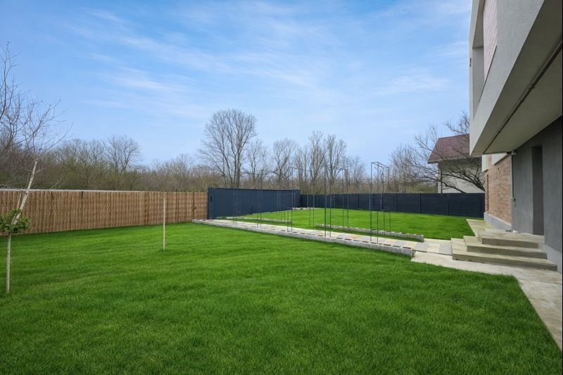 Curtea este amenajată elegant, cu gazon, flori și pomi ornamentali, completată de un sistem automat de irigare, alei pietonale bine definite și 3 locuri de parcare.