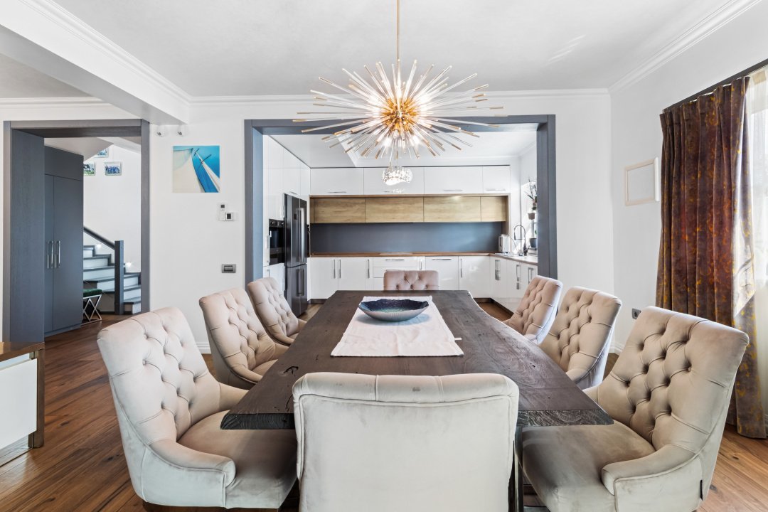 Mobilată complet cu mobilier import Spania și Italia, utilată cu electrocasnice premium SMEG, finisaje interioare cu piatră naturală, ceramica de calitate superioara, usi de interior import Spania, tencuială decorativă exterioară de calitate, izolație exterioară eficientă, acoperiș din țiglă ceramică.