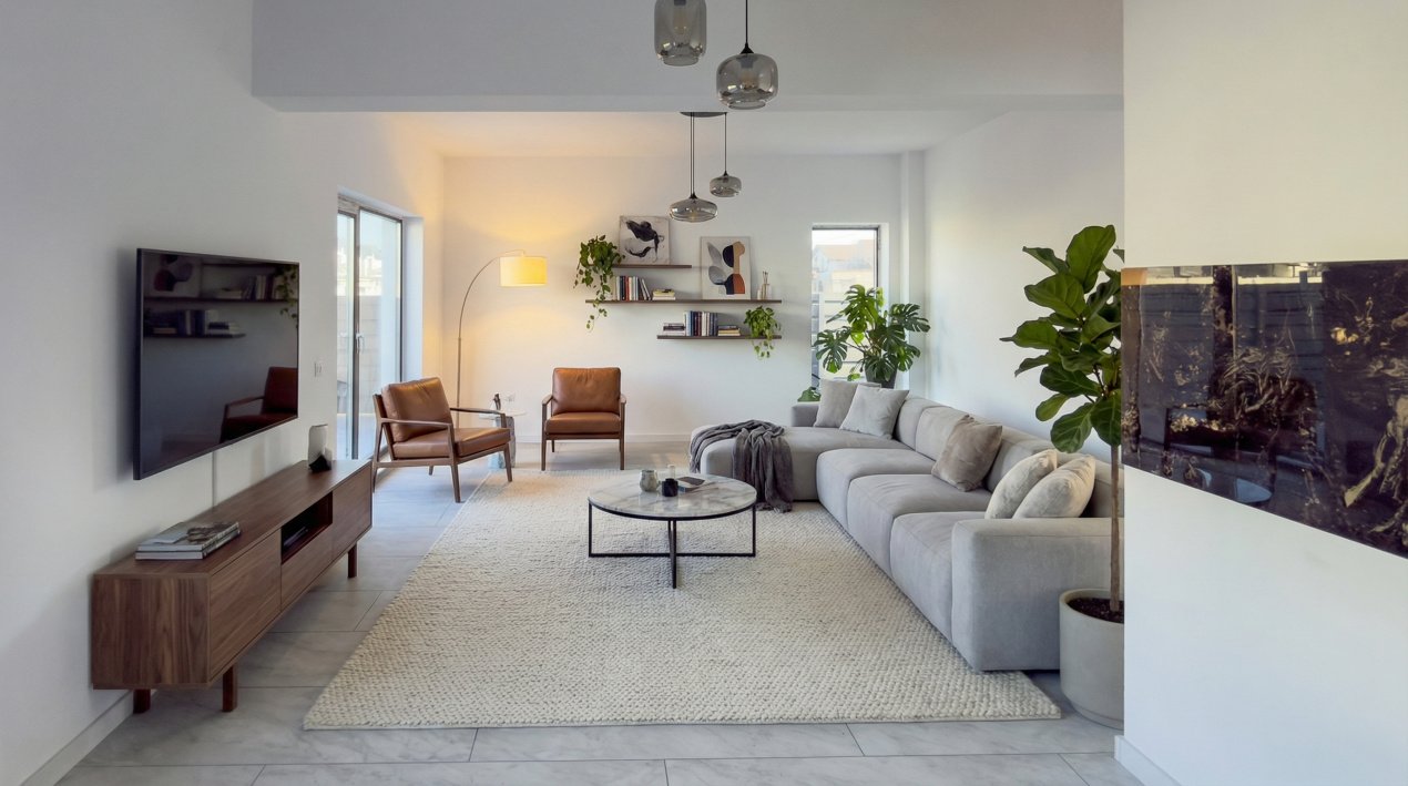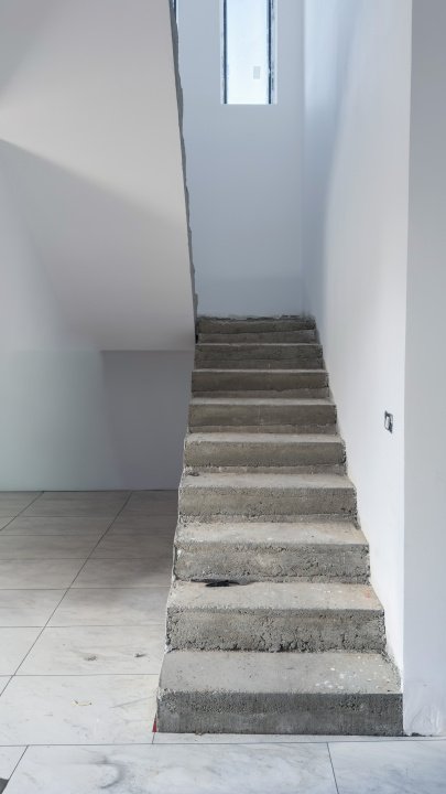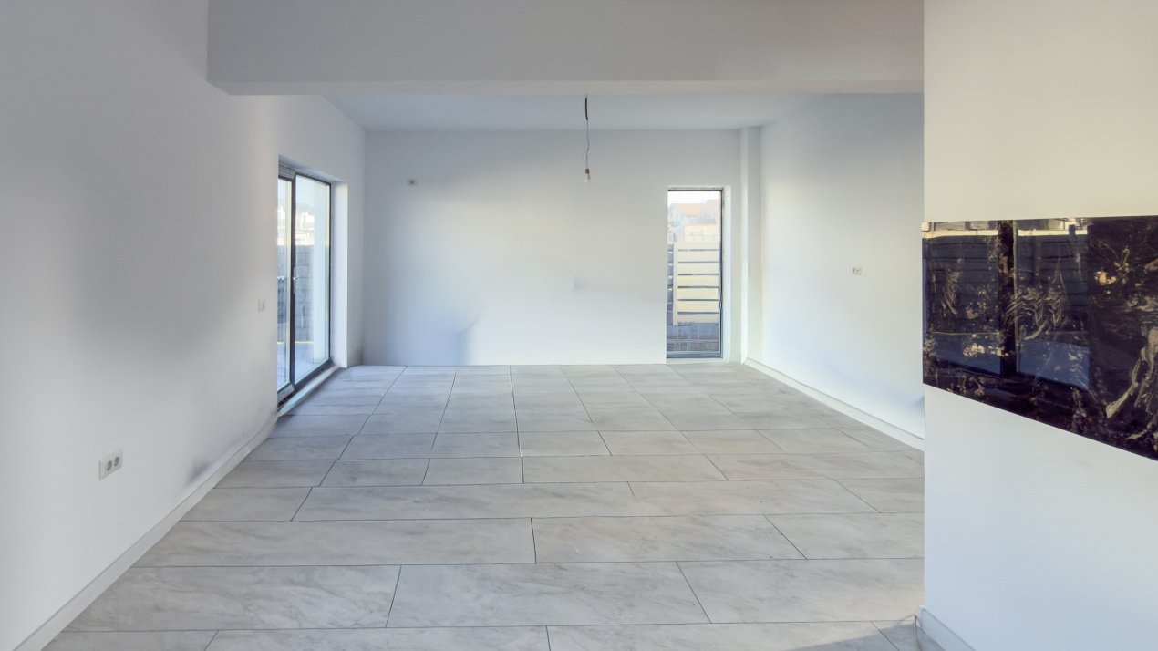 Parterul adună viața de zi cu zi: living luminos, bucătărie open-space și ieșire directă către terasă și curtea generoasă, cu peste 300 mp liberi. Un spațiu unde liniștea, joaca și serile în familie își găsesc locul.