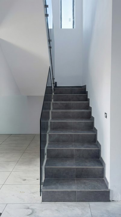 La etaj, patru dormitoare, trei băi cu geam și un balcon creează zona de intimitate. Scara interioară solidă leagă armonios cele două niveluri.