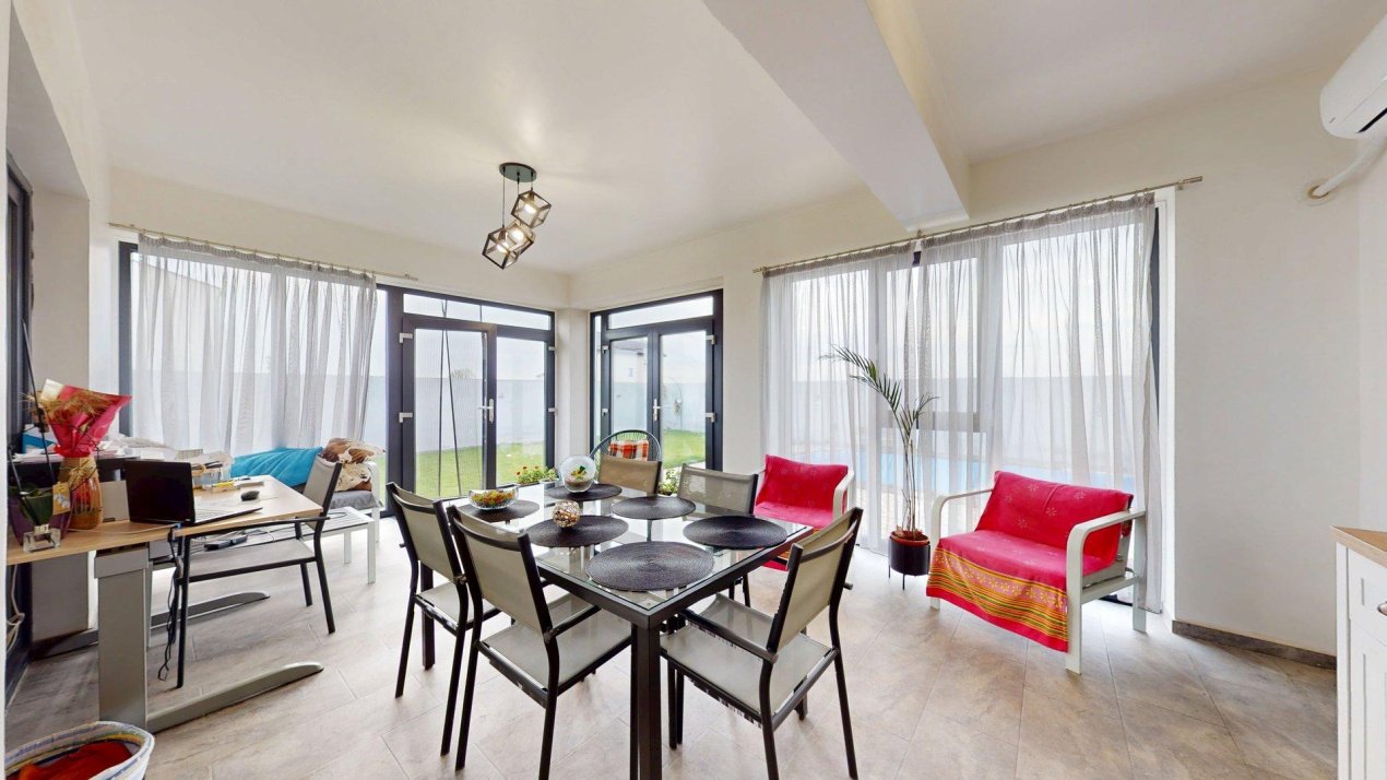 Terasa reprezintă un punct forte al locuinței — închisă cu suprafețe vitrate mari, izolată termic și dotată tot cu încălzire în pardoseală, aceasta poate fi utilizată confortabil în orice sezon. În plus, terasa integrează perfect două spații suplimentare extrem de utile: o baie cu duș și o zonă tehnică prevăzută cu spațiu generos pentru depozitare.