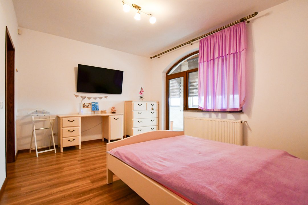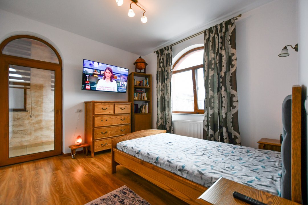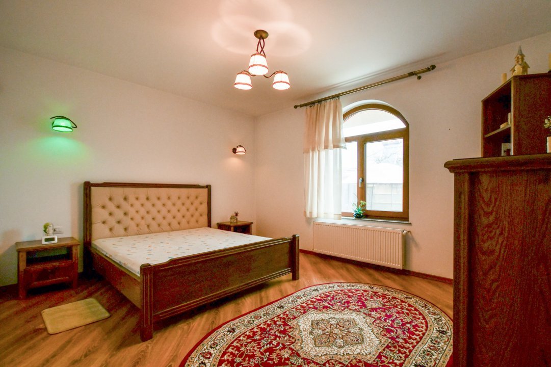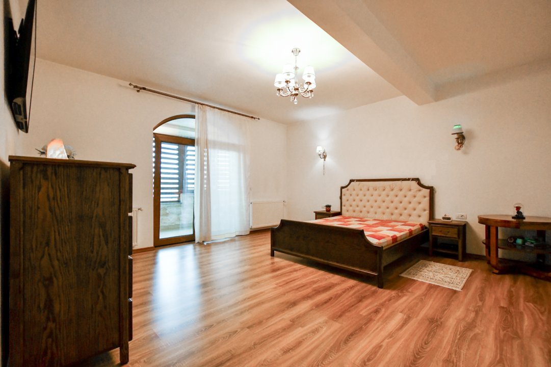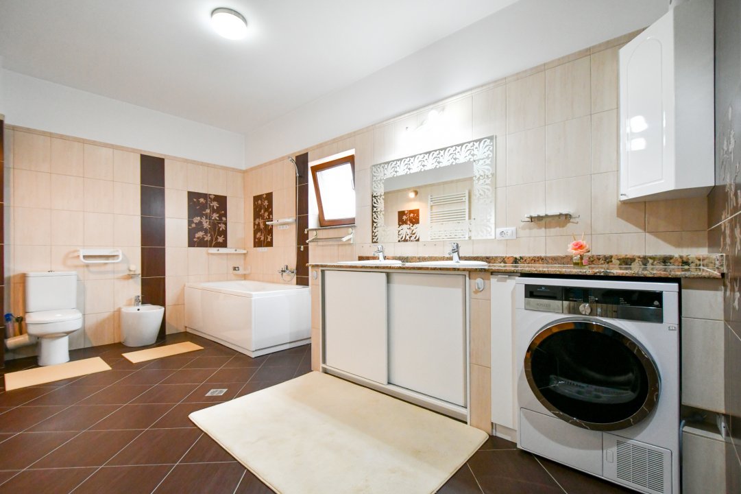 Ferestre din PVC (8 camere nuanta stejar) GEALAN si QFORT cu geam tripan reflexiv si geam sablat ornament, pervazuri din granit si feronerie MACO, gresie si faianta ceramica portelanata, parchet laminat trafic intens 12mm, instalatii alimentare apa din PPR (verde) cu bariera termica, instalatie scurgere/canalizare ingropata cu evacuare mare de ø160, instalatii termice din PPR verde cu bariera termica si UPONOR prin manson de protectie asistate de distribuitoare de caldura montate pe fiecare nivel, centrala termica pe gaz RIELLO FAMILY ITALIA 36KW in condensare cu boiler 110L incorporat si stabilizator de tensiune, calorifere otel si portprosop in bai, sistem fotovoltaic compus din 12 panouri Sharp cu putere 6,8 KW montate pe ferme metalice (costuri minime in timp - prosumator de 3 ani), invector Huawei putere 12KW, bransament 380V cu putere instalata 15KW, instalatii electrice 220V din cupru multifilar (bransament general Ø6, coloane alimentare Ø4, prize Ø2,5 si iluminat Ø2,5) asistate de tablou sigurante automate elaborat pe fiecare nivel, cu prize si intrerupatoare modulare Schneider si doze generale de legatura in fiecare camera, instalatie curenti slabi (internet si cablu TV) in camere, aparat de aer conditionat Mitsubishi Inverter 22000 BTU, sistem de alarma PARADOX, conectat la firma de paza si monitorizare video 24h/24h cu 8 camere de luat vederi receiver si monitor, videointerfon, usi interior din lemn stratificat cu garnituri etansare si feronerie premium, scara interioara din beton armat cu trepte placate lemn frasin si mana curenta lemn, usa acces imobil din PVC cu ranforsare antiefractie, baile dotate cu obiecte sanitare de la diverse firme de prestigiu IDEAL STANDARD - HANSGROHE etc, interior finisat cu stucco venetian si zugraveli lavabile.