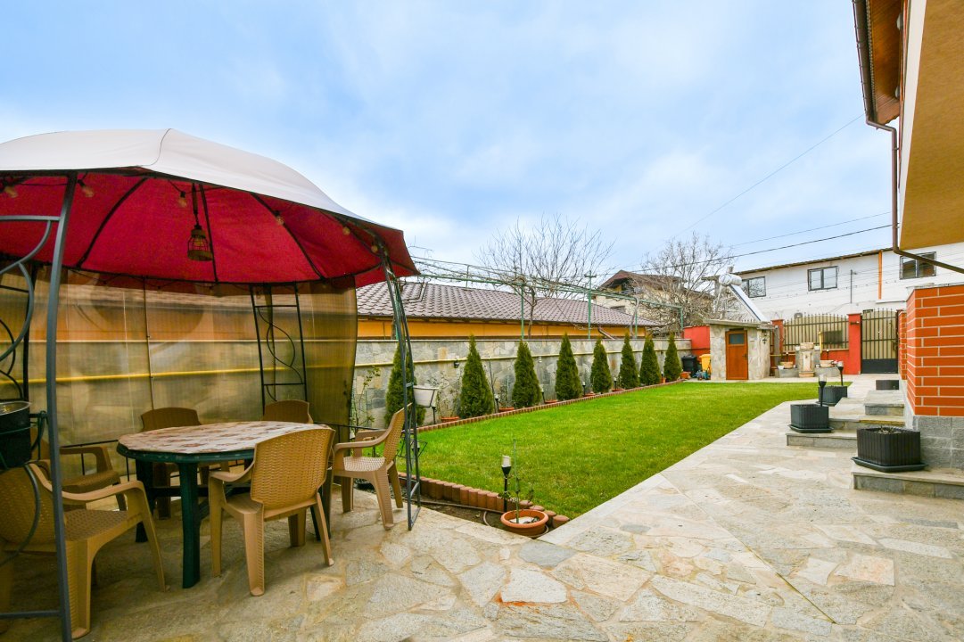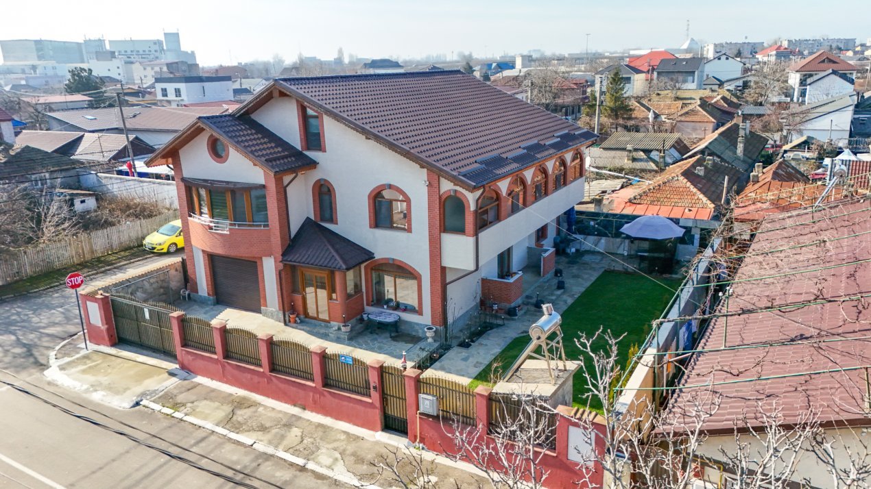 Constructia este realizata pe structura independenta de cadre din beton armat cu subsol realizat integral din beton armat cu cota de fundare 4,40m pe perna de piatra compactata, impermeabilizat si termoizolat cu strat bitum cauciucat, polistiren extrudat 5cm, strat caramida, membrana tefond si inca un rand de polistiren extrudat 5cm. Zidaria exterioara realizata din caramida Porotherm cu 8 celule (27cm) izolata exterior cu polistiren expandat 10cm finisat cu tencuiala decorativa structurata siliconata si placari caramida aparenta si zidarie interioara din caramida 20cm, ceeace asigura izolare fonica si termica superioara. Acoperisul este realizat in sistem asterial cu lemn ignifugat, bazie din lemn de fag lacuit cu jgheaburi de scurgere si burlane ingropate, invelit cu tigla metalica vopsita antistatic pe ambele parti si termoizolat in 2 straturi - polistiren extrudat (10cm) si vata minerala cu folie aluminiu anticondens (5cm), finisat interior cu rigips verde antiumezeala. Proprietatea dispune de un put forat (37m adancime din care 12m de apa) dotat cu hidrofor, care alimenteaza sistemul de irigatie automatizat cu 13 aspersoare si instalatie picurator cu panou de comanda/automatizare si sistem bypass pentru alimentare casa in caz de necesitate/urgenta. Curtea este amenajata cu alei placate cu piatra naturala import Italia montata pe pat de beton armat cu plasa sudata de Buzau (conferind rezistenta ridicata in timp si stabilitate), zone gazon, flori, pomi si plante ornament, grup sanitar de curte construit din zidarie BCA placat integral cu piatra naturala cu acoperis tigla metalica si sistem solar pentru apa calda menajera, zona foisor cu toate instalatiile necesare trase, robinet de curte, sifoane colectoare si rigole scurgere ape pluviale, gard perimetral din zidarie BCA cu structura din beton armat finisat cu tencuiala decorativa siliconata + interior placat cu piatra naturala si poarta acces auto actionata din telecomanda.