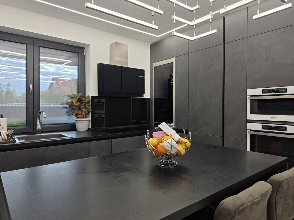 Bucătărie complet utilată (electrocasnice Bosch: plită, cuptor, cuptor cu microunde, mașină de spălat vase, frigider încorporat)