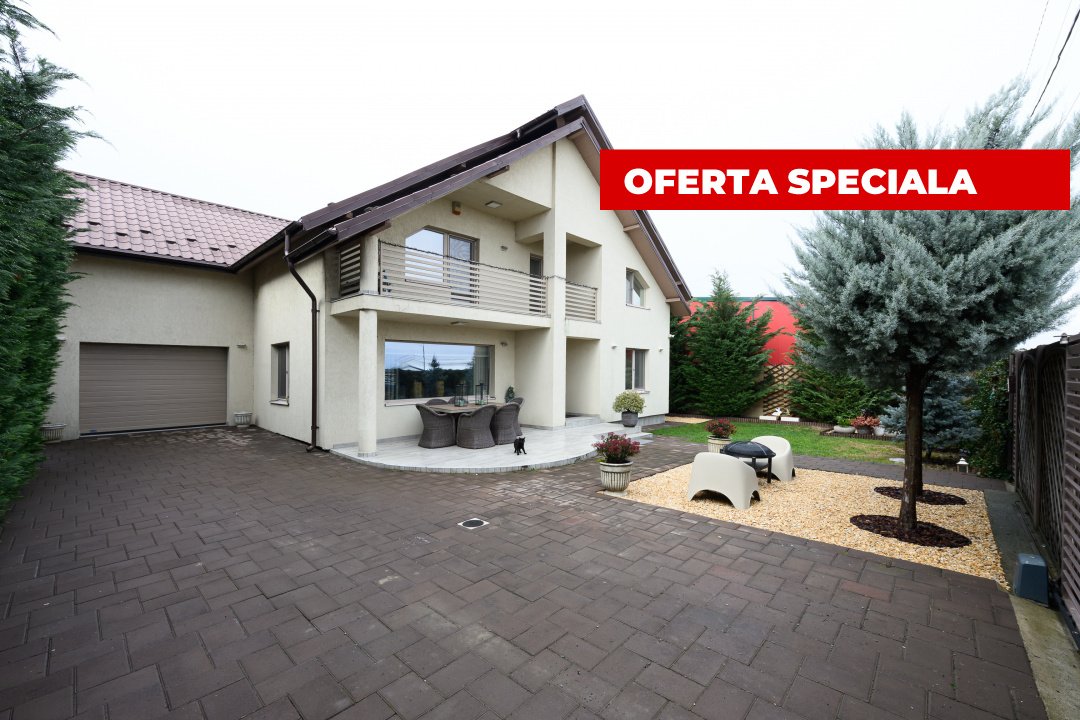*** Terenul de 450 mp este amenajat cu gazon și vegetație matură, creând un ambient plăcut și intim. Proprietatea este completată de sistem de supraveghere video, porți electrice din fier și se vinde complet mobilată și utilată, conform prezentării.